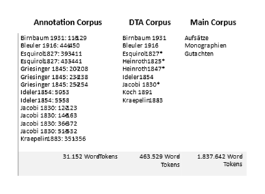 In der ersten Projektphase geht es um den Aufbau umfassender Gesamt- sowie themenspezifischer Spezialkorpora (building a corpus). Die Projektstandorte Heidelberg und Paderborn arbeiten unabhängig voneinander an dem Aufbau ihrer jeweiligen Korpora. Dabei geht es dem Projektstandort Paderborn vor allem um eine diachrone Erfassung zentraler psychiatrischer Fachtexte aus Lehrbüchern sowie Fachzeitschriften vom 19. bis zum 20. Jahrhundert. Methodisch unterschieden wird hinsichtlich des Aufbaus a) eines Gesamtkorpus (main corpus), in das alle Texte einfließen (bisher ca. 2 Mio. Tokens), b) eines DTA-Korpus (dta corpus), bestehend auf kanonischen Lehrbüchern, das im Laufe des Projektverlaufs ins DTA eingepflegt werden soll sowie c) eines Annotationskorpus (annotation corpus), das der explorativen Aufarbeitung charakteristischer Sprachhandlung in diesen Texten dient.