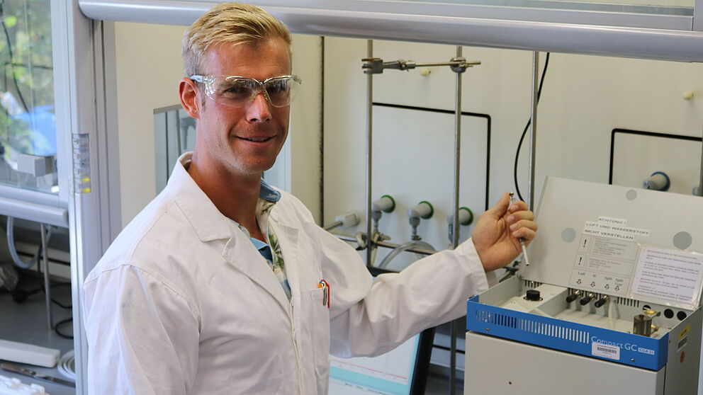 Foto (Universität Paderborn, Melissa Kaffka): Hinter den Türen der Technischen Chemie: Promovend Christian Hoppe bei seiner Arbeit im Labor. In seiner Freizeit spielt er Ultimate Frisbee und war Top Scorer auf der letzten Europameisterschaft im Juni.
