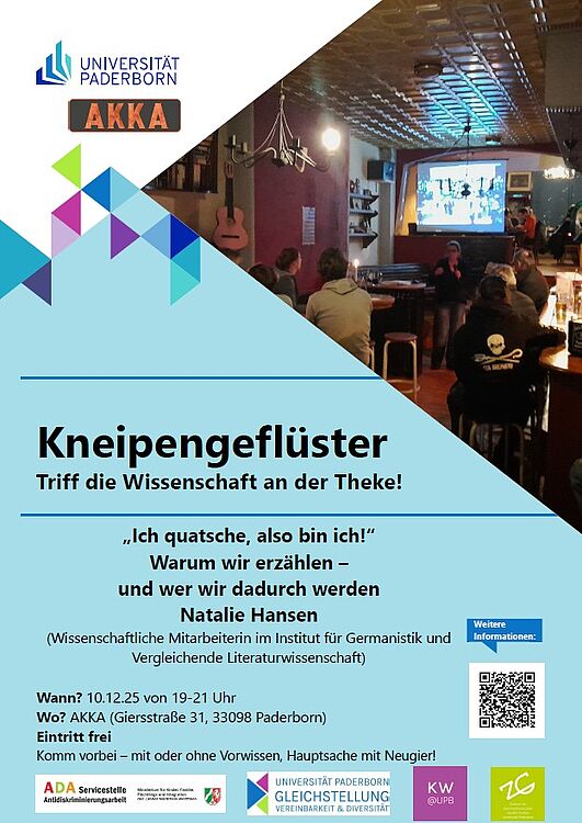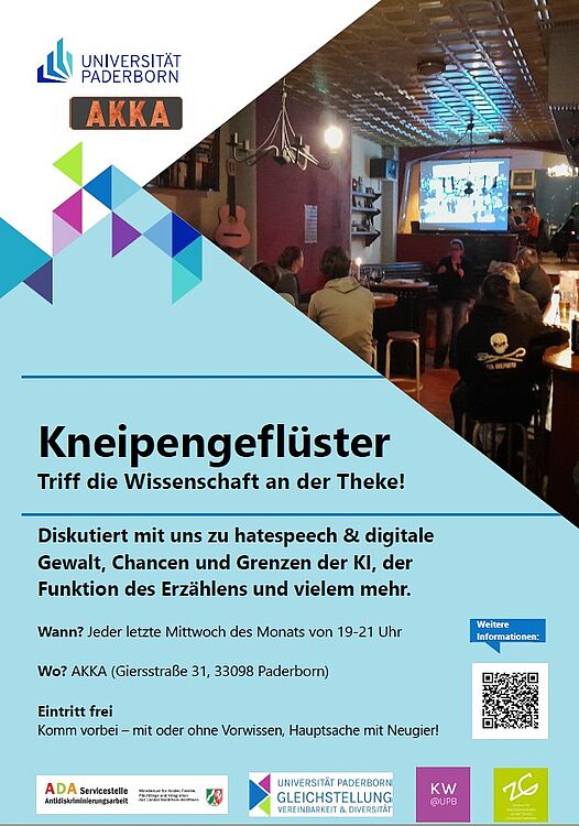 Wissenschaft trifft Kneipenatmosphäre: Unter diesem Motto rufen die Prodekanin für Nachhaltigkeit, Gleichstellung und Diversität der Fakultät für Kulturwissenschaften, Dr. Larissa Eikermann, die Geschäftsführerin des Zentrums für Geschlechterstudien / Gender Studies, Dr. Claudia Mahs, und die Referentin für Diversity, Laura Maring gemeinsam mit der Servicestelle Antidiskriminierung (ADA) des Caritasverbands Paderborn e.V. eine neue Veranstaltungsreihe ins Leben. Künftig sollen Expert*innen eingeladen werden, um über aktuelle, spannende und manchmal auch brisante Themen und Forschungsergebnisse in lockerer Runde zu diskutieren.