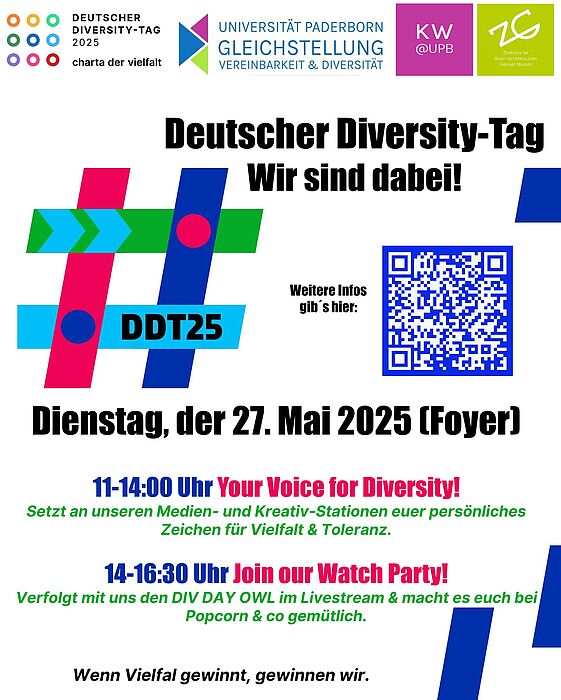 For 13 years now, the Diversity Charter has been calling on companies, organisations and educational institutions to take part in the annual "German Diversity Day". Paderborn University is following the call and invites you to the foyer on Tuesday, 27 May under the motto "Your voice for diversity - diversity matters!". University members are encouraged to participate creatively and have various opportunities to set an example for diversity and against marginalisation. The event will take place from 11 am to 2 pm.