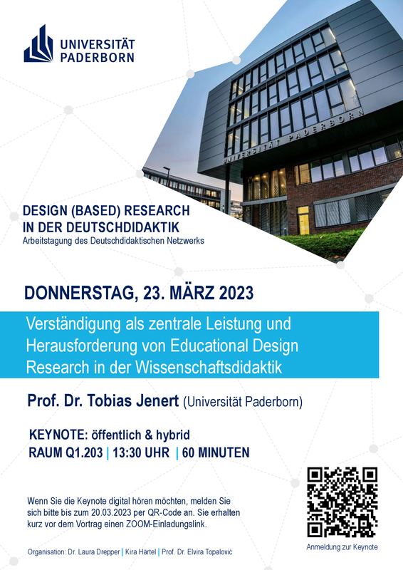 Die Veranstaltung ist Teil der zweiten Arbeitstagung des Deutschdidaktischen Netzwerks zum Thema „Design (Based) Research in der Deutschdidaktik“, die am 23. und 24. März in Paderborn stattfindet. Organisiert wird die Netzwerktagung von Dr. Laura Drepper, Kira Härtel und Prof. Dr. Elvira Topalović, alle drei von der Universität Paderborn.