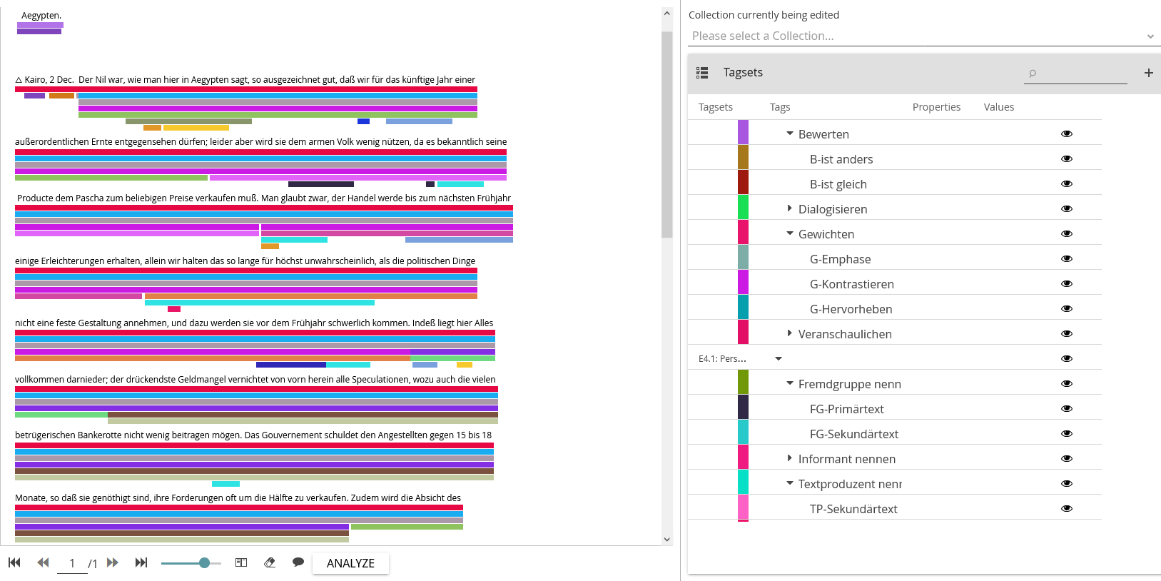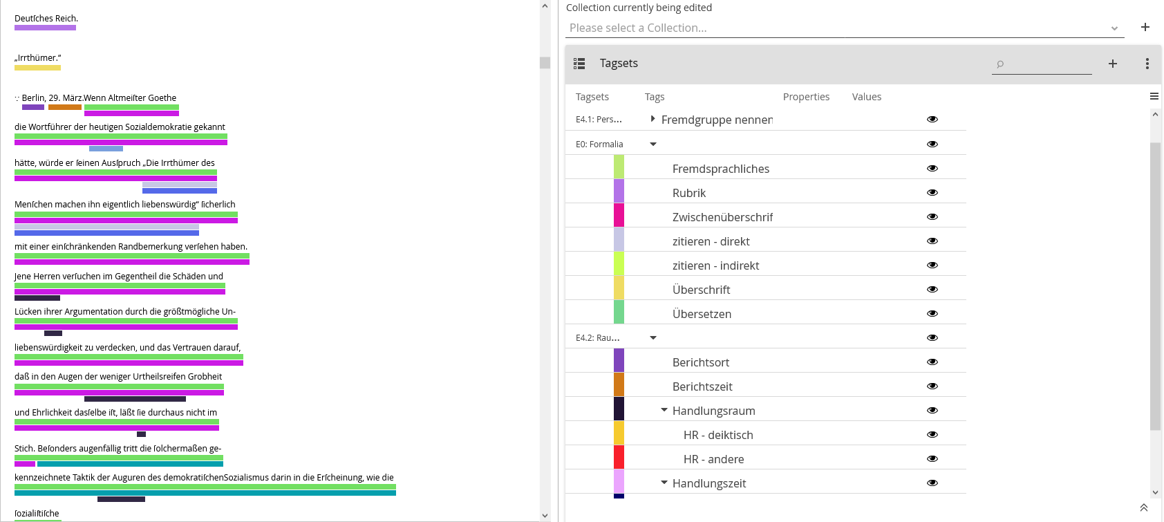 Die qualitativ orientierte manuelle Annotation berührt Aspekte der funktionalen, stilistischen, thematischen und Beziehungsdimension, die mittels automatischer Verfahren nicht erschlossen werden können. Das Projektteam hat sich für die manuelle Annotation für das browserbasierte Textannotations- und -analysetool CATMA 6.0 entschieden, da es die Möglichkeit bietet, taxonomisch aufgebaute individuelle Tagsets beliebiger Komplexitätsstufen zu erstellen, indem Annotationen problemlos verändert werden können.