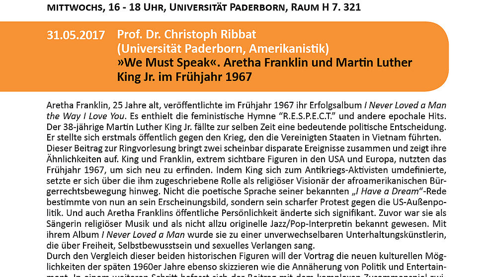 Am Mittwoch, 31. Mai, 16 Uhr, hält Prof. Dr. Christoph Ribbat, im Rahmen der Ringvorlesung "Kunst|be|griffe 5", einen Vortrag über Aretha Franklin und Martin Luther King Jr. im Frühjahr 1967 – »We Must Speak«.