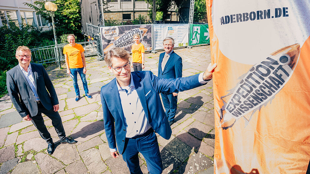 Foto (Universität Paderborn, Besim Mazhiqi): Zur Eröffnung der „Expedition Wissenschaft“ begrüßten (v. l.) Dr. Jochen Viehoff (Geschäftsführer des Heinz Nixdorf MuseumsForums), Jens Reinhardt (Leiter des Amtes für Öffentlichkeitsarbeit und Stadtmarketing), Prof. Dr. René Fahr (Vizepräsident für Wissens- und Technologietransfer der Universität Paderborn), Dr. Kristina Stog (Projektleiterin „Expedition Wissenschaft“ der Stadt Paderborn) sowie Paderborns Bürgermeister Michael Dreier.