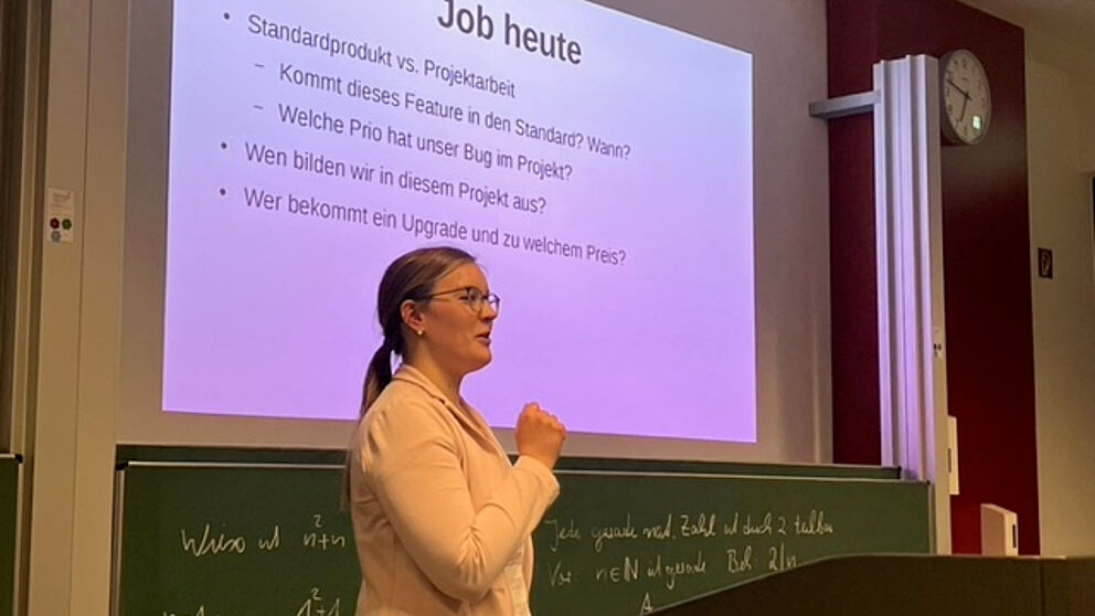 Melanie Bruns von PSI Logistics und Stephan Müller von adesso SE am Standort Paderborn trugen im Rahmen der Berufsbilder-Vortragsreihe der Matiker vor.