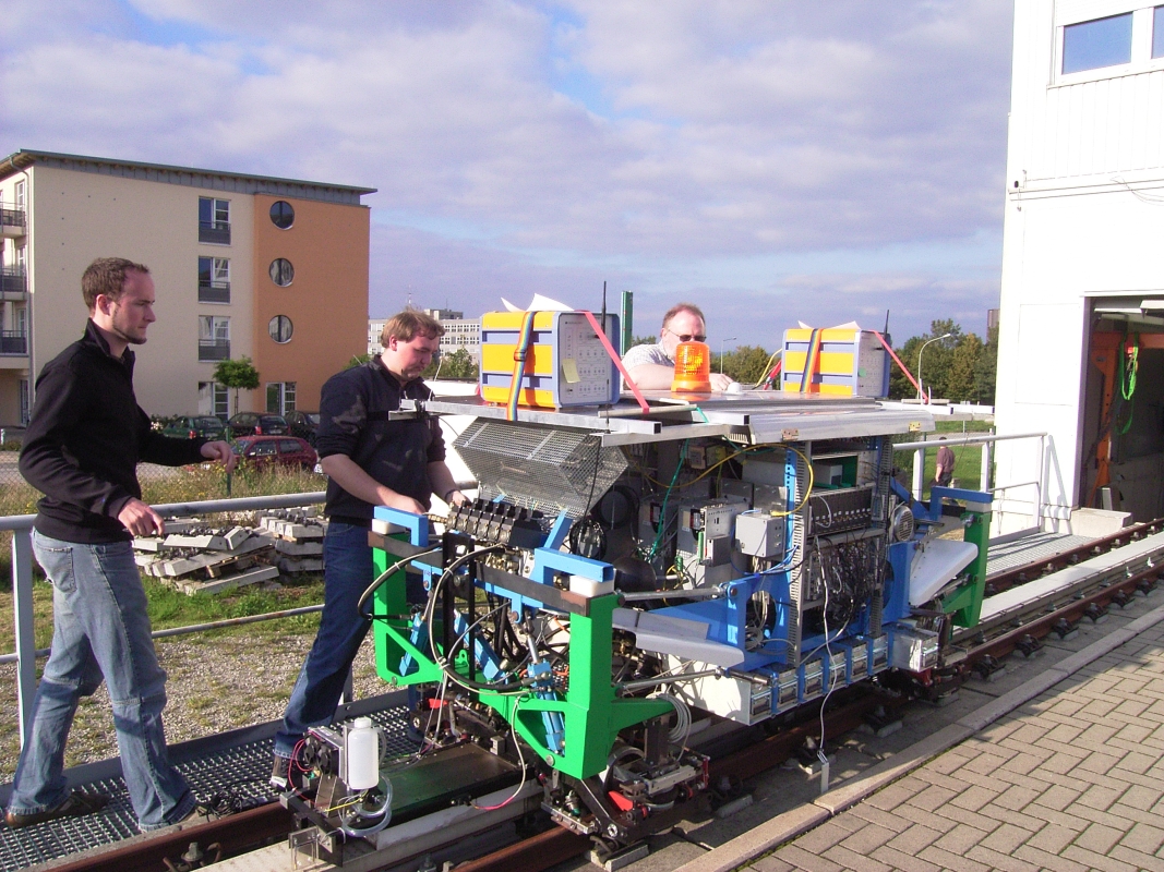 Foto (Sascha Lutters): Letzte Änderungen vor der Testfahrt: Studenten und Mitarbeiter (v. li.: Christian Kunzmann, Markus Jürgens, Hans-Joachim Kraus) des Fachgebiets Rechnernetze installieren zwei kooperativ funkende Prototypen (orange) auf dem RailCab-Schienenfahrzeug der Neuen Bahntechnik Paderborn.