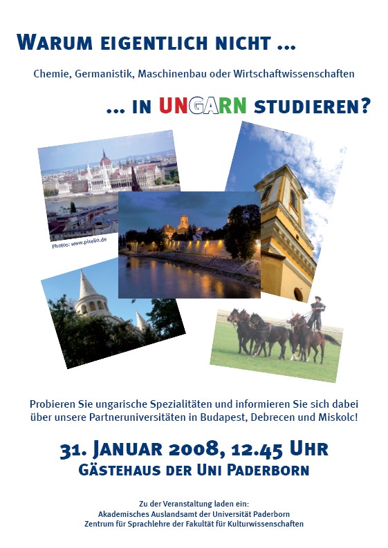 Um das Interesse an Ungarn, der ungarischen Sprache und an einem Studium in Budapest, Miskolc, Szeged, Pécs oder Debrecen zu wecken, laden das Akademische Auslandsamt und das Zentrum für Sprachlehre (ZfS) am 31.1. 2008 von 12.45 bis 14.30 Uhr zu einer „Informationsveranstaltung Ungarn“ ins Gästehaus der Universität ein.