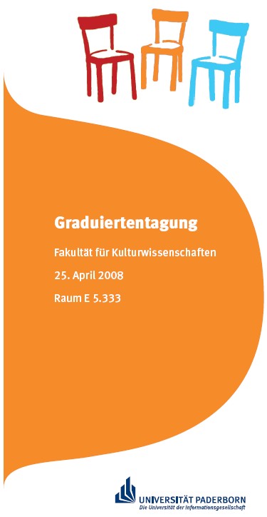Am 25. April 2008 findet ab 9.00 Uhr bis ca. 16.30 Uhr im Raum E 5.333 die Graduiertentagung der Fakultät für Kulturwissenschaften statt. Die Tagung steht im Zeichen des konstruktiven Miteinanders und möchte den Doktorandinnen und Doktoranden der Kulturwissenschaften die Möglichkeit geben, sich fachlich und persönlich auszutauschen und neue Kontakte zu knüpfen. Darüber hinaus soll die Tagung auch den Grundstein für einen zukünftigen Dialog legen. Alle Interessierten sind herzlich eingeladen, sich einen Eindruck von der großen Themenvielfalt in der kulturwissenschaftlichen Forschung zu machen.