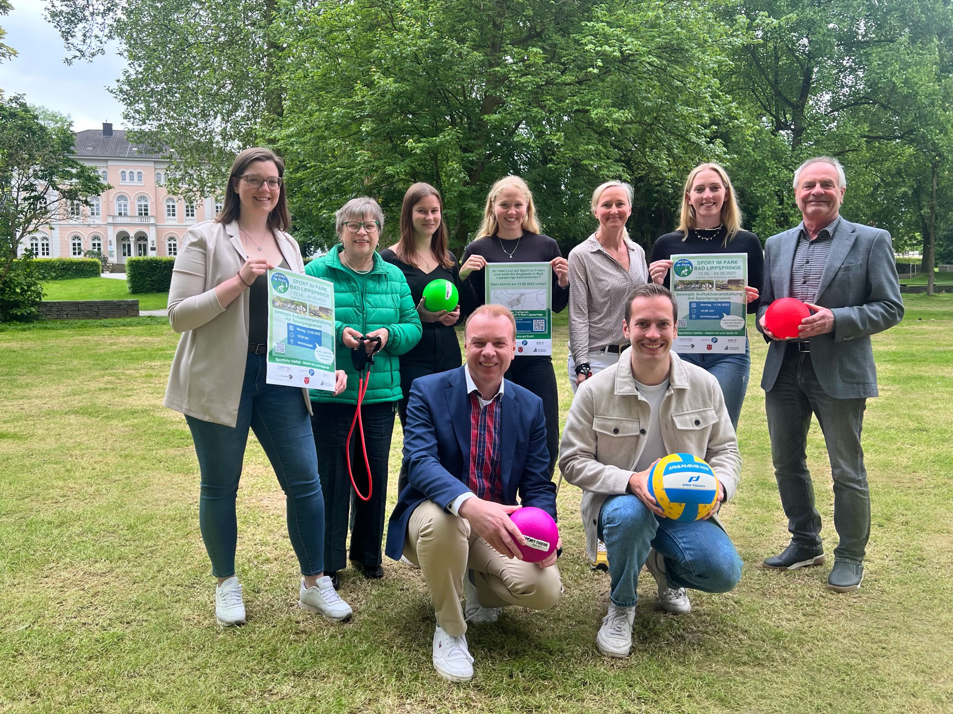 Foto (Anna Kaiser, Stadtmarketing Bad Lippspringe): Freuen sich auf das Projekt „Sport im Park“ in Bad Lippspringe: (hinten v. l.) Carina Moss (Projektkoordination, Kreissportbund Paderborn e. V.), Ulrike Köhler (Vorsitzende des Stadtsportverbands Bad Lippspringe), Anna Menz und Anahita Schumacher (Studentinnen der Angewandten Sportwissenschaft an der Universität Paderborn), Dr. Hilke Teubert (betreuende Dozentin der Universität Paderborn), Studentin Lisa Venrath, Diethelm Krause (Präsident Kreissportbund Paderborn) sowie (vorne v. l.) Ulrich Lange (Bürgermeister der Stadt Bad Lippspringe) und Student Henning Bunsmann.