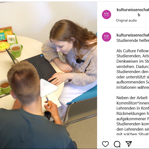 Um die Verständigung zwischen Lehrenden und Studierenden zu verbessern, haben wir im Projekt DigiSelF studentische 'Culture Fellows' (oder: CuFe) ausgebildet. Sie nehmen an Lehrveranstalungen teil, nehmen irritierende und schwer verständliche Situationen seitens der Studierenden auf und besprechen diese Mit den Lehrenden. Auf Instagram stellen sich unsere 'CuFes' vor