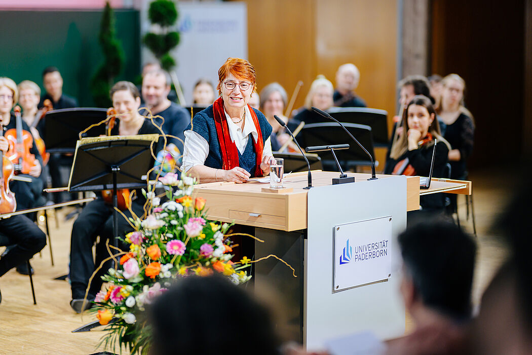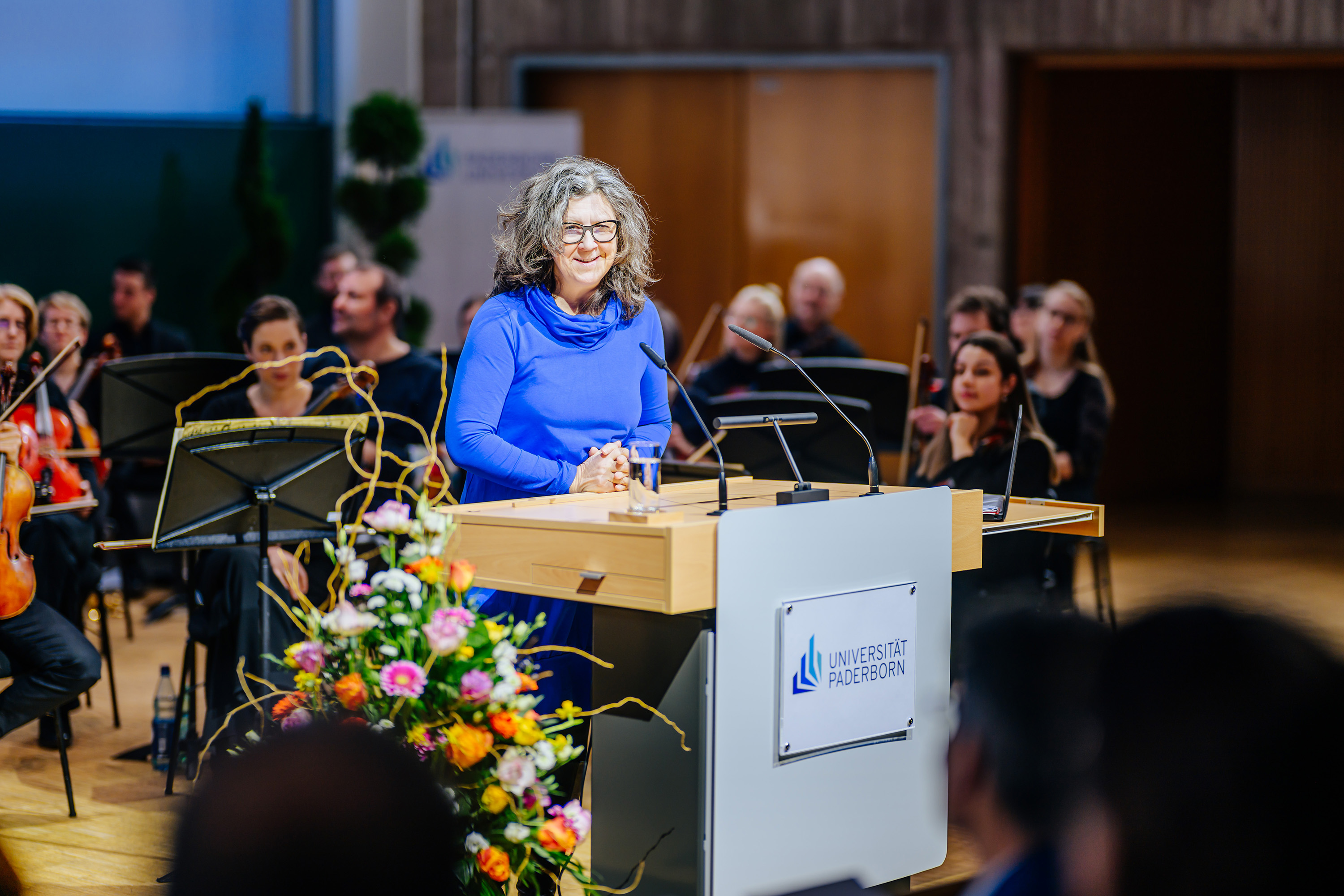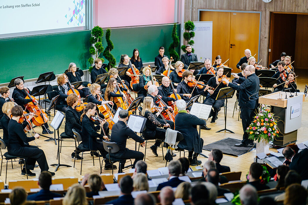 Paderborn University celebrated its traditional New Year’s reception on Sunday 21 January with the University Orchestra, an awards ceremony and around 400 guests from the worlds of science, business and politics. During her speech in the auditorium, Professor Birgitt Riegraf looked back over the past year and took advantage of the opportunity to review her term of office as university president: ‘We have achieved a lot and set many things in motion together. We have strengthened research and teaching at Paderborn University, given it a stronger network and visibility on a regional level, and laid the foundations to ensure that this development continues in the future. In many ways, our university is perhaps the best it has ever been. I can now only encourage you to work together to continue this success story for the future.’
