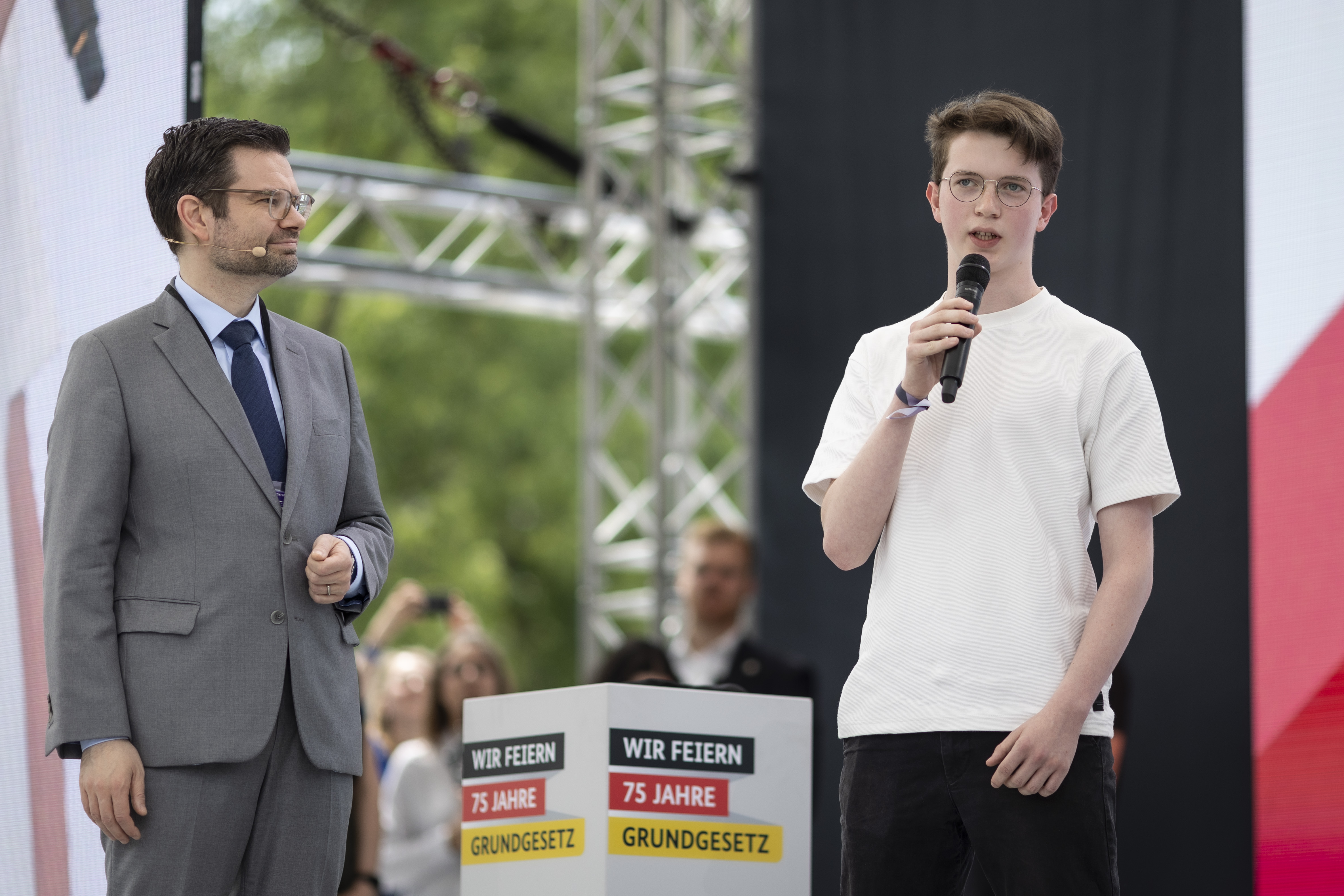 How do young people in Germany view the constitution? What role does it play in the lives of schoolchildren? What thoughts and emotions do they associate with it? Young people were asked to address questions like these in the Germany-wide ‘My Constitution’ competition, in which selected school scholarship programmes took part and which was initiated by the Federal Ministry of Justice (BMJ) and the NRW Centre for Talent Development at the Westphalian University of Applied Sciences. The video by three scholarship holders from the ‘NRWTalente – Region OWL’ programme, which is run by Paderborn University, was one of the best entries and received an award from Federal Minister of Justice Marco Buschmann at the Democracy Festival in Berlin.