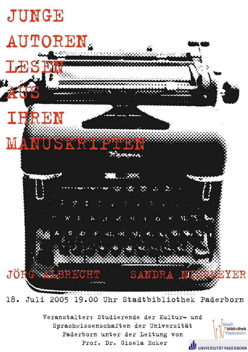 Höhepunkt und Abschluss des Projektseminars bildet eine von den Studierenden organisierte öffentliche Lesung in der Stadtbibliothek am Dienstag, 18. Juli, 19 Uhr. Eingeladen sind Sandra Niermeyer und Jörg Albrecht, zwei hoffnungsvolle Nachwuchsautoren aus der Region. Interessenten sind herzlich eingeladen, der Eintrittspreis beträgt 2 Euro.