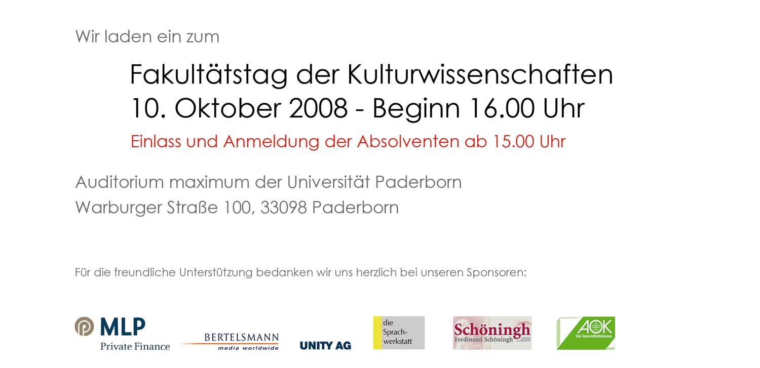 Am Freitag, 10. Oktober 2008, findet um 16 Uhr der zweite Fakultätstag der Kulturwissenschaften der Universität Paderborn im Audimax statt. Es werden 140 Absolventen der 10 Institute und des Faches Geographie, Professoren und Mitarbeiter sowie Angehörige der Absolventen anwesend sein, so dass mit insgesamt etwa 600 Teilnehmern gerechnet wird. Musikalisch untermalt wird die Feier durch den Chor UNISONO, das Gitarren Duo Carovacz & Leßmann sowie Eckhard Wiemann am Klavier.