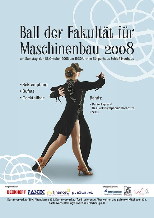 Der Countdown läuft: Am Samstag, 18. Oktober 2008, findet wieder der Ball der Fakultät für Maschinenbau im Bürgerhaus Schloß Neuhaus statt. Einlass ist ab 19.30 Uhr.