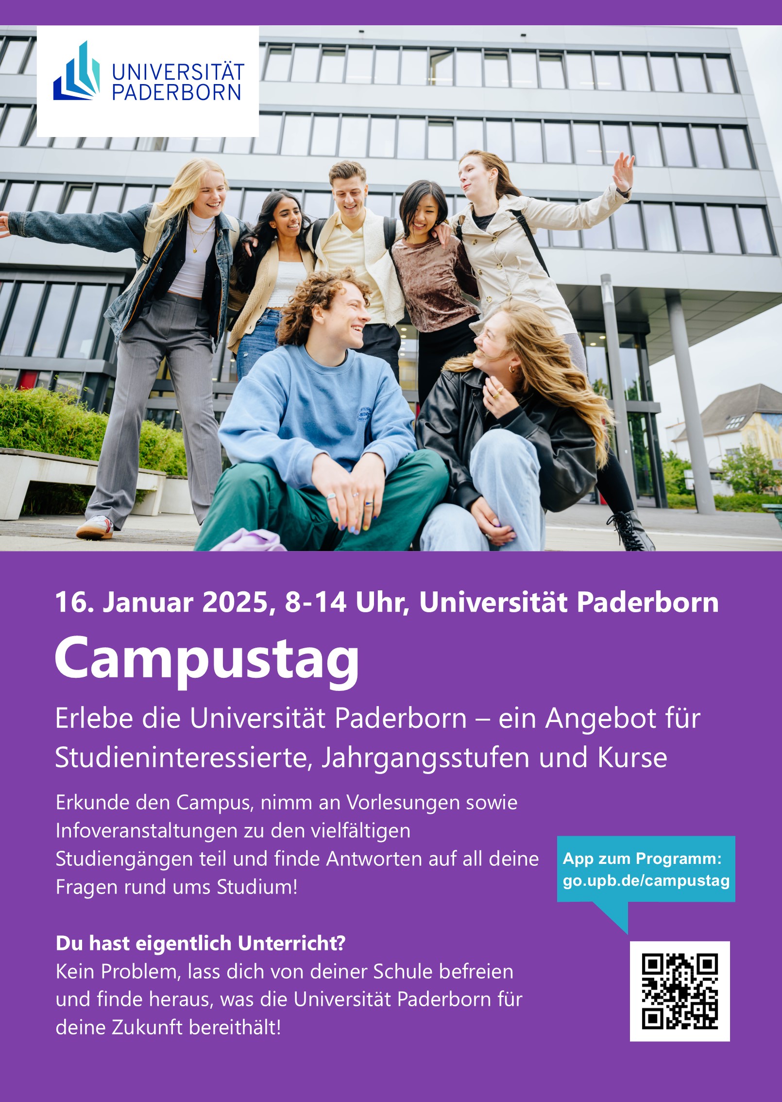 Talk to students and take part in real lectures: This is possible at the Campus Day at Paderborn University. On Thursday, 16 January, pupils and prospective students can look forward to a varied programme from 8 am to 2 pm. Whether International Business Studies, Physics, Linguistics, Electrical Engineering or a teaching degree programme - with over 120 offers, visitors can get a taste of various degree programmes and obtain valuable information on course content, career prospects and study requirements. Prior registration is not necessary. Pupils who would like to take part in the Campus Day can be exempted from school fees. Further information can be found on the event page.