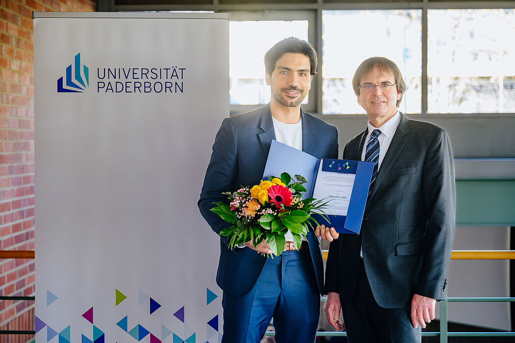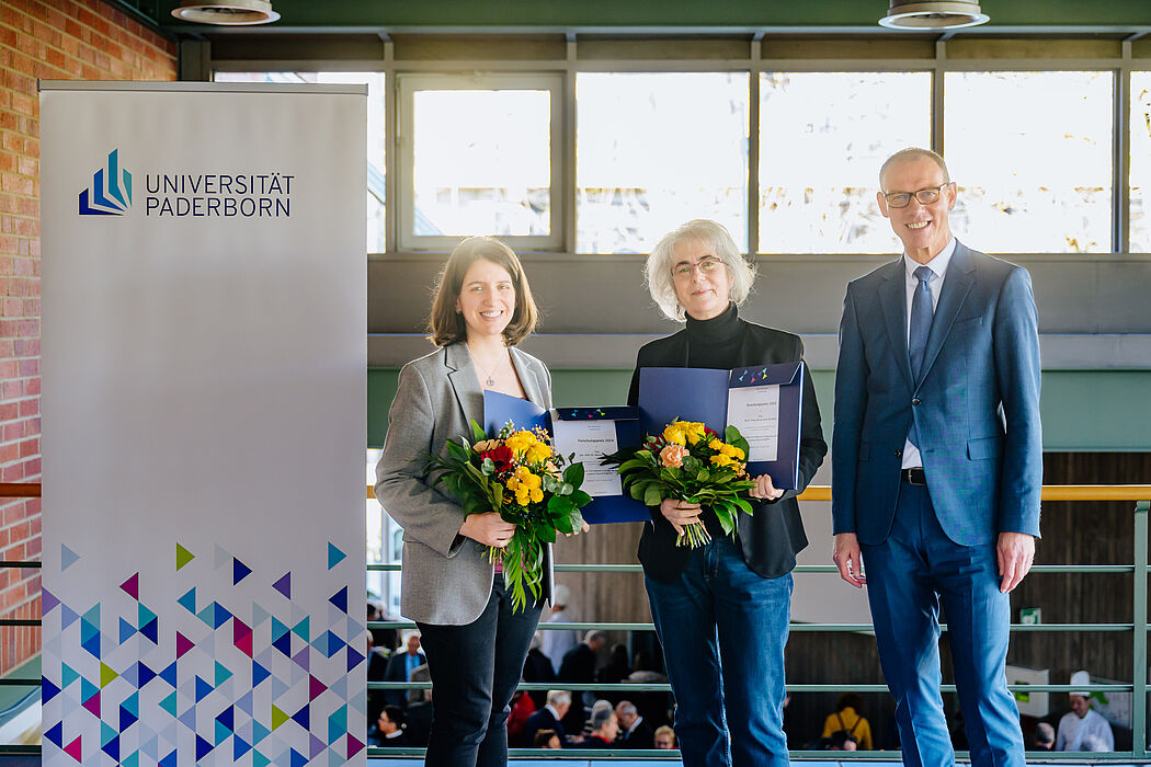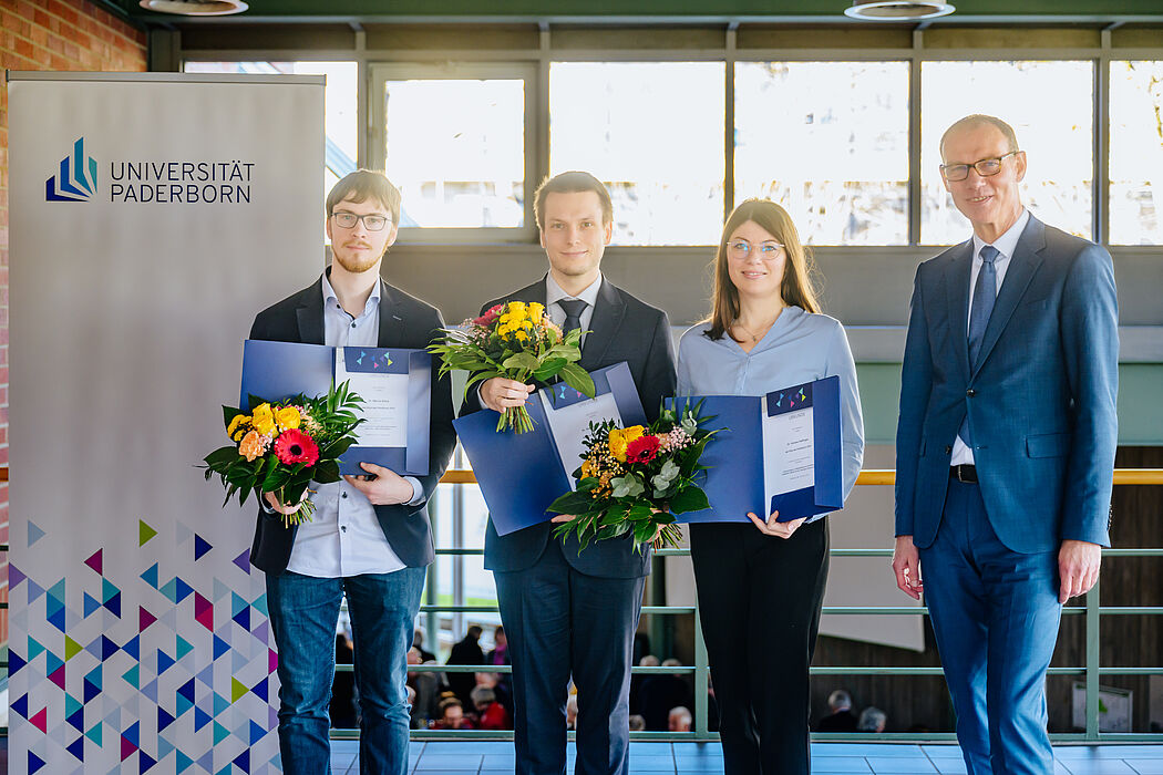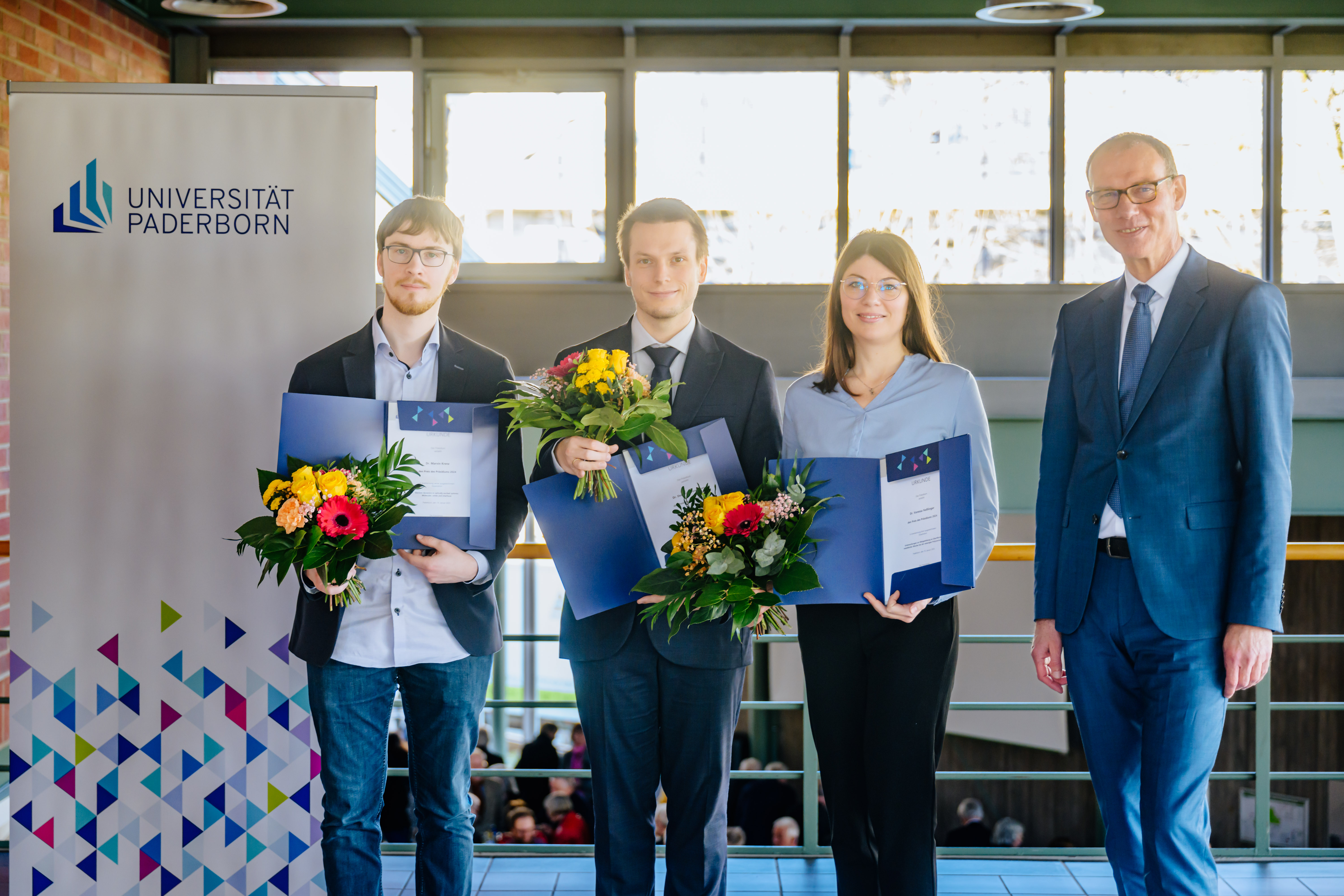 On behalf of the Presidential Board, Prof Dr Johannes Blömer, Vice President for Research and Young Academics at Paderborn University, presented four academics with awards for outstanding doctoral dissertations. These are endowed with prize money of 2,500 euros each. Chemist Dr. Vanessa Neßlinger received the prize for her work on "Investigations into the formation of deposits on the surfaces of metallic mixers during aqueous polymerisation". Materials physicist Dr Marvin Krenz was honoured for his research on "Electron dynamics in optically excited systems: Molecules, solids and interfaces". The doctoral dissertations of two scientists from the Faculty of Computer Science, Electrical Engineering and Mathematics were also honoured. Dr Milad Alshomary conducted research on the topic of "Audience-Aware Argument Generation" in his thesis, while Dr Dominik Brennecken was awarded the prize for his doctoral dissertation entitled "Contributions to Dunkl Theory".