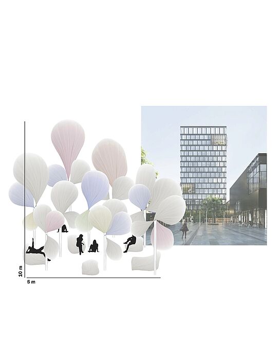 With their installation "Atmospheres of Science", Prof Kürtz, Detmar and Pallas said they wanted to "visualise the invisible dynamics of the atmosphere". Weather balloons, symbolic of the 27 European countries, were to change their colours with the help of real-time weather data and thus make the diversity of meteorological processes tangible. By using robust, durable materials such as Cordura and Kevlar as well as energy-efficient LED technology, the design combined artistic expressiveness with a clear commitment to sustainability. In addition, organically shaped seating objects were planned to invite visitors to interact and reflect directly.