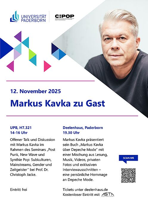 In the evening, Kavka will read from his book "Markus Kavka über Depeche Mode" at Deelenhaus Paderborn (Krämerstraße 8-10, 33098 Paderborn) from 7.30 to 9.30 pm. In addition to a classic reading, the former MTV presenter will combine passages from the book with songs by Depeche Mode as well as videos, private photos and excerpts from interviews he conducted with the band. Tickets for this event are available on the Deelenhaus website and cost 20 (regular) or ten euros (concessions). Paderborn University students receive free admission as part of the AStA culture ticket on presentation of their student ID.