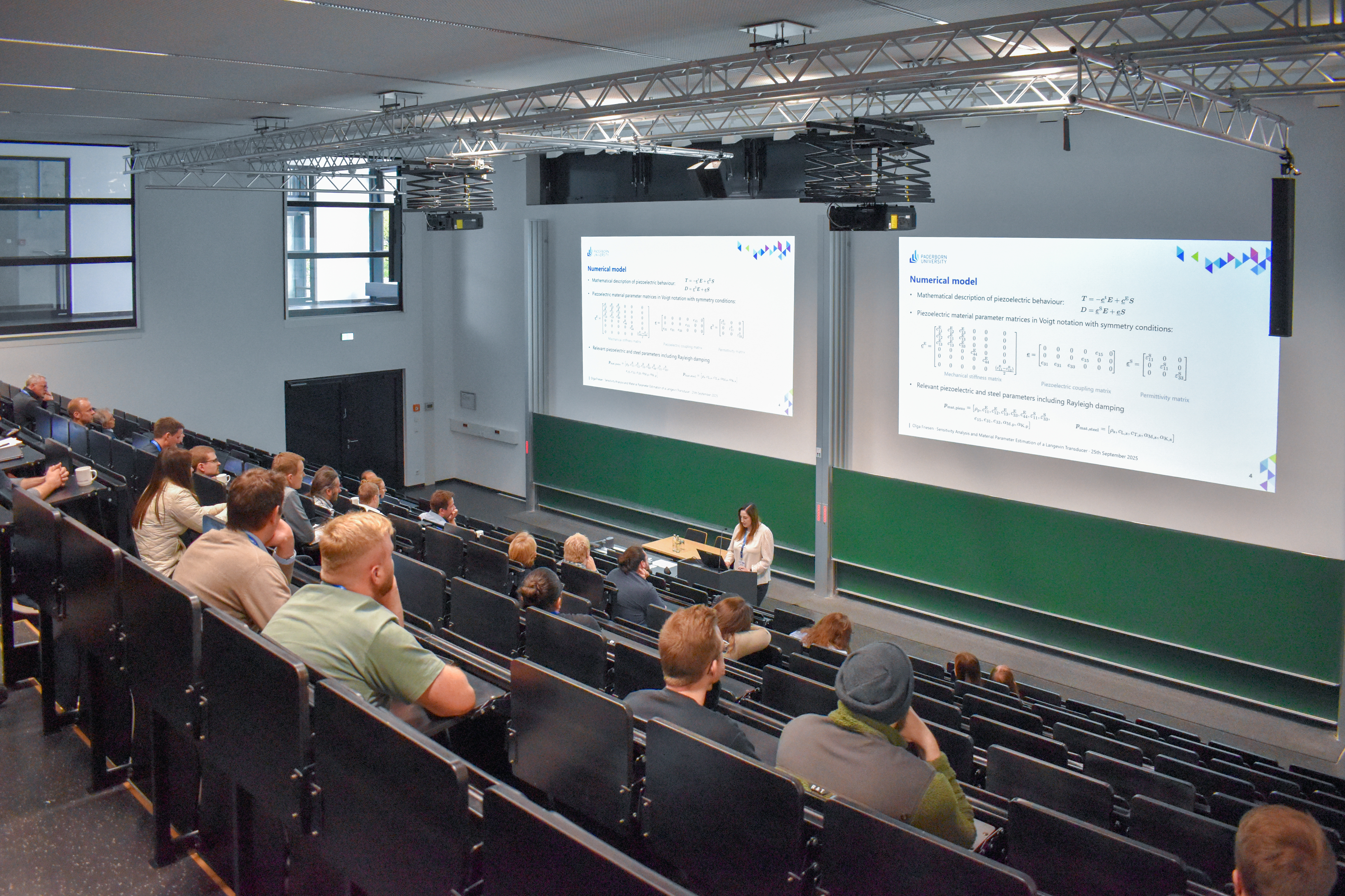 To conclude the third year of research in the NEPTUN group, a special session was secluded at the 2025 International Congress on Ultrasonics (ICU), which took place in September in Paderborn. The session was comprised of six talks from different members of the group and included new theoretical and application related results. Carsten Spieker and Jonas Hölscher opened the session with their talks on simulation results titled “Modeling and simulation of the behavior of piezoceramics with the discontinuous Galerkin method” and “Multiscale thermo-piezoelectric simulations using the finite element method”. Raphael Kuess continued with some new insights into the optimisation process to determine piezoelectric material parameters in “Identification of temperature-dependent material parameter functions in piezoelectricity”. The forth talk, held by Olga Friesen and titled “Sensitivity Analysis and Material Parameter Estimation of a Pre-Stressed Langevin Transducer”, included results on the material parameters of complete power-ultrasound transducers. Similarly, Claus Scheidemann presented the results of long-term observations in “Investigation of the Setting Behaviour of Mechanically Biased Piezoelectric Ultrasonic Transducers”. The session, and incidentally the conference, was concluded by Leander Claes with an approach for dynamic nonlinear material parameter determination in “Estimation of third order elastic constants of piezoceramics using DC biased impedance measurements”.