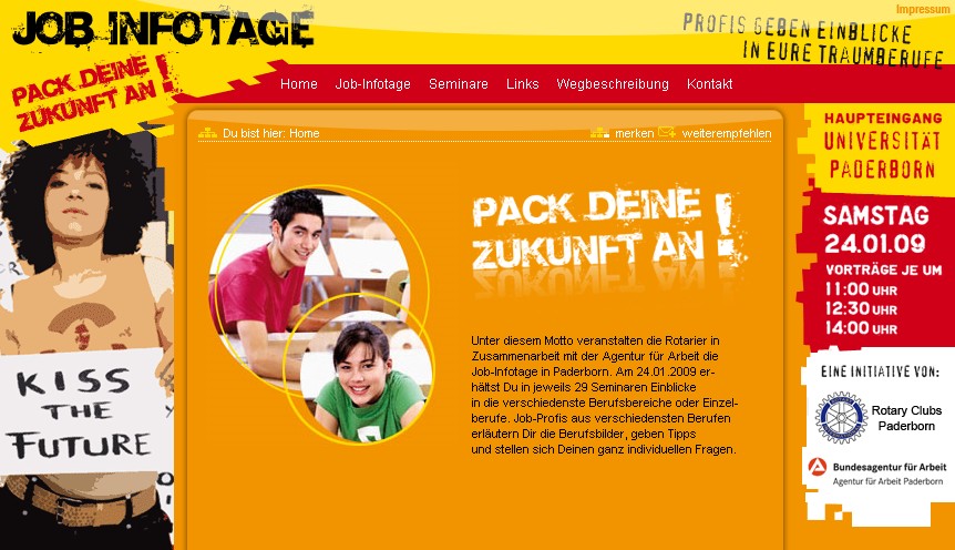 Um den Schülerinnen und Schülern entgegen zu kommen, wurden die Veranstaltungen zentriert und ein neues Konzept entwickelt. Die Universität stellt für den Berufsinformationstag die geeigneten Räumlichkeiten zur Verfügung. Die Veranstaltungen werden angeboten am Samstag, 24.1.2009, von 11.00 bis ca. 16.00 Uhr. Infos über die Räumlichkeiten der einzelnen Veranstaltungen sind im Internet aufrufbar unter http://www.job-infotage.de/ und auch auf Informationstafeln im Uni-Haupteingangsbereich einsehbar. Dort stehen qualifizierte Mitarbeiter der Bundesagentur für Arbeit für weitere Auskünfte zur Verfügung. Traditionell ist auch die Studienberatung der Universität Paderborn präsent und informiert über das Thema Studienplatzvergabe.
