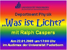 Das „Maus“-Team von Ralph Caspers wurde neulich von der Deutschen Physikalischen Gesellschaft mit einer Medaille für naturwissenschaftliche Publizistik ausgezeichnet. Caspers wendet sich an der Uni Paderborn in diesem Kolloquium hauptsächlich an junge Zuschauerinnen und Zuschauer. Die Frage „Was ist Licht“ will Caspers anhand von Beispielen und Experimenten beantworten. Unterstützt wird er dabei diesmal nicht, wie bei „Wissen macht Ah“, von seiner Assistentin Shary Reeves, sondern von Professoren und Mitarbeitern des Departments Physik. Das musikalische Rahmenprogramm wird von der Big Band des Gymnasiums Theodorianum unter Leitung von Herrn Dr. Liebrand gestaltet. Unterstützt wird die Veranstaltung von den Unternehmen dSPACE und Lightpower.
