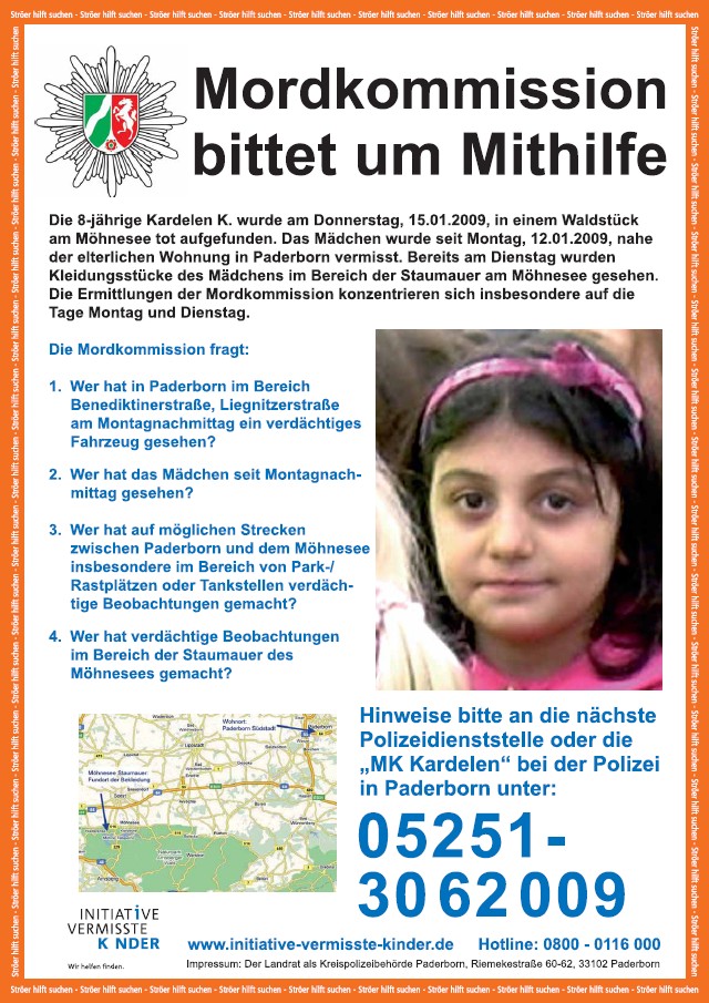 Die 8-jährige Kardelen K. wurde am Donnerstag, 15.1.2009, in einem Waldstück am Möhnesee tot aufgefunden. Das Mädchen wurde seit Montag, 12.1.2009, nahe der elterlichen Wohnung in Paderborn vermisst. Bereits am Dienstag wurden Kleidungsstücke des Mädchens im Bereich der Staumauer am Möhnesee gesehen. Die Ermittlungen der Mordkommission konzentrieren sich insbesondere auf die Tage Montag und Dienstag.
