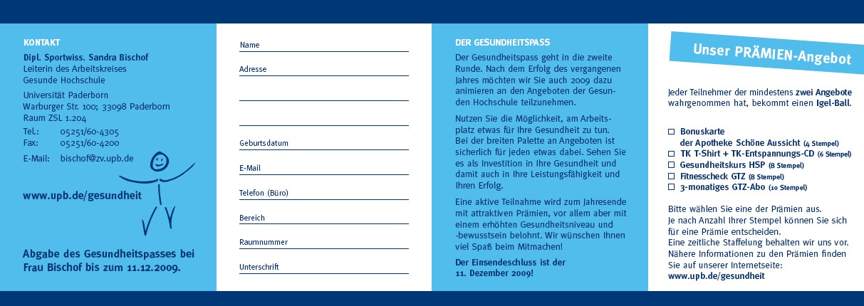 Die Teilnahme an den Angeboten wird im Rahmen der jeweiligen Angebote auf dem Gesundheitspass abgestempelt. Der Gesundheitspass kann dann bis zum 11. Dezember 2009 bei Sandra Bischof (s. u.) eingereicht werden.
