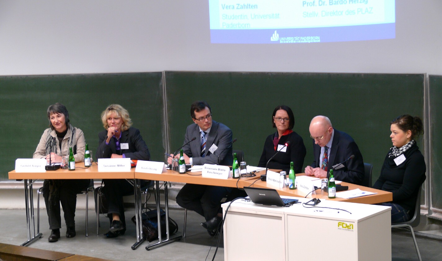 Zum Einstieg in die Expertenrunden am Nachmittag wurde im Rahmen einer Podiumsdiskussion das Kompetenzprofil des neuen Grundschullehramts erörtert. Unter der Moderation von Prof. Dr. Bardo Herzig, dem stellvertretenden Direktor des PLAZ, beteiligten sich Vertreterinnen aus Schule, Studienseminar und Universität an der Diskussion. Dabei wurde dort und im Rahmen der fachbezogenen Workshops am Nachmittag besonders ein Kernelement des künftigen Grundschullehramts kontrovers diskutiert.