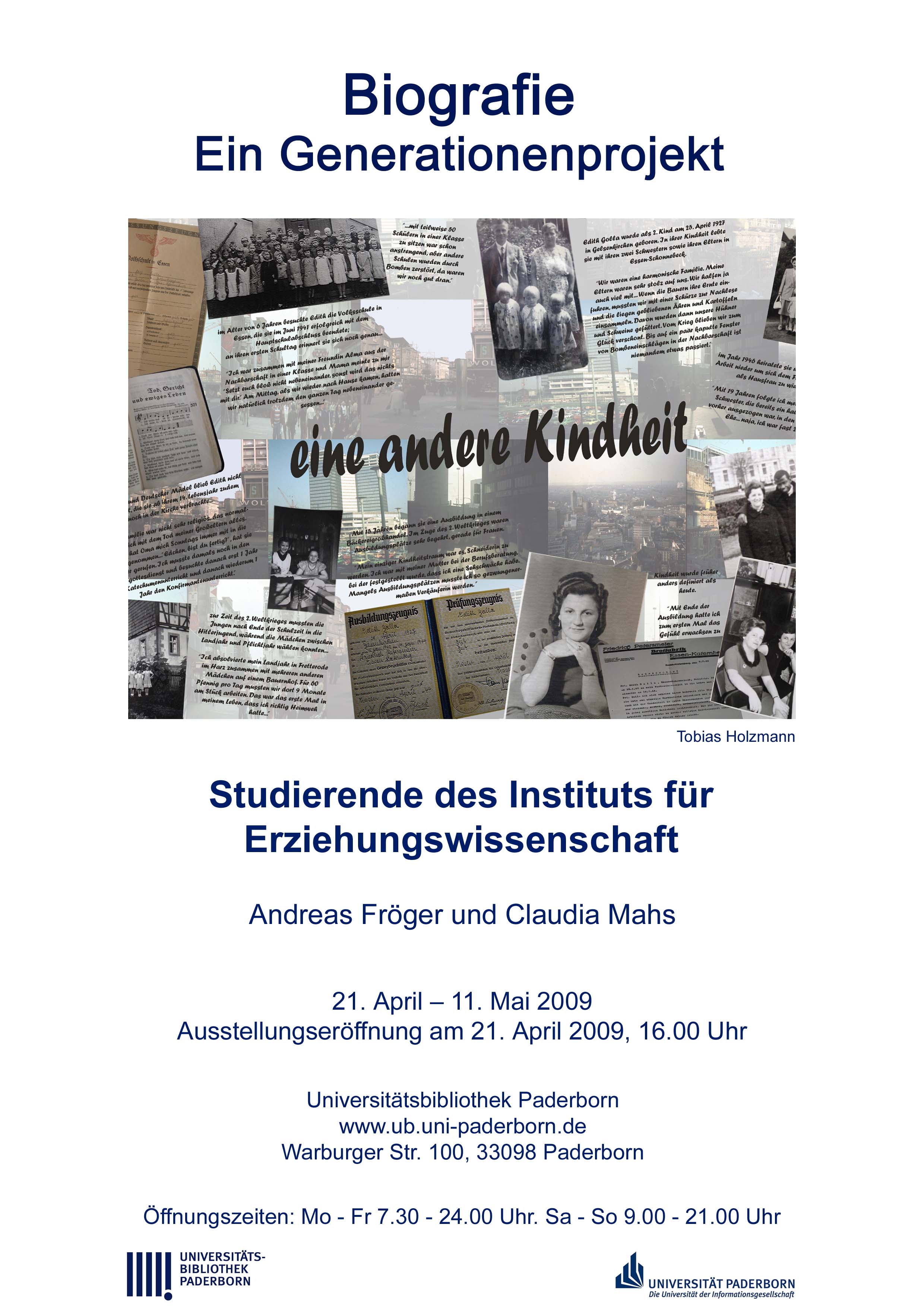 Vom 21.4. bis einschließlich 11.5. werden im Foyer der Bibliothek der Universität Paderborn Exponate zum Thema „Biografie – ein Generationenprojekt“ von Studierenden des Instituts für Erziehungswissenschaft gezeigt, die im Rahmen eines Projektseminars erarbeitet wurden. Die Ausstellung umfasst „Gemälde“, Kurzfilme, Fotocollagen und einiges Überraschendes mehr.