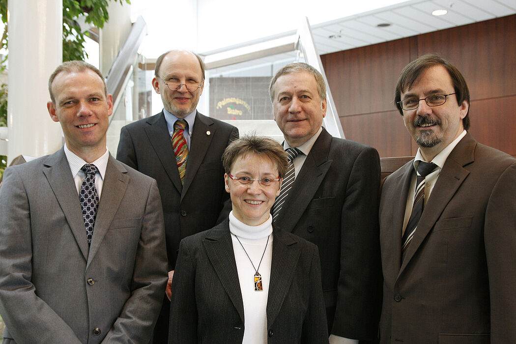 Foto (Tanja Bilanzola): Hauptredner und Organisatoren des 4. Paderborner Tages der IT-Sicherheit : (v. l.) Prof. Johannes Blömer (Universität Paderborn), Dr. Walter Fumy (Bundesdruckerei, Berlin), Dr. Gudrun Oevel (Universität Paderborn), Dr. Michael Laska (Universität Paderborn), Prof. Gregor Engels (Universität Paderborn).