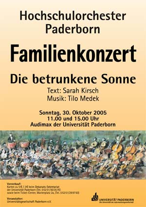 Bereits zum dritten Mal spielt das Hochschulorchester der Universität Paderborn unter der Leitung von Steffen Schiel ein Konzert für Familien. Nach dem „Karneval der Tiere“ und „Auf zu Mozart ins Konzert“ steht am Sonntag, 30.10.2005 um 11.00 und 15.00 Uhr im Audimax der Universität „Die betrunkene Sonne“ des Komponisten Tilo Medek nach einem Text von Sarah Kirsch auf dem Programm.