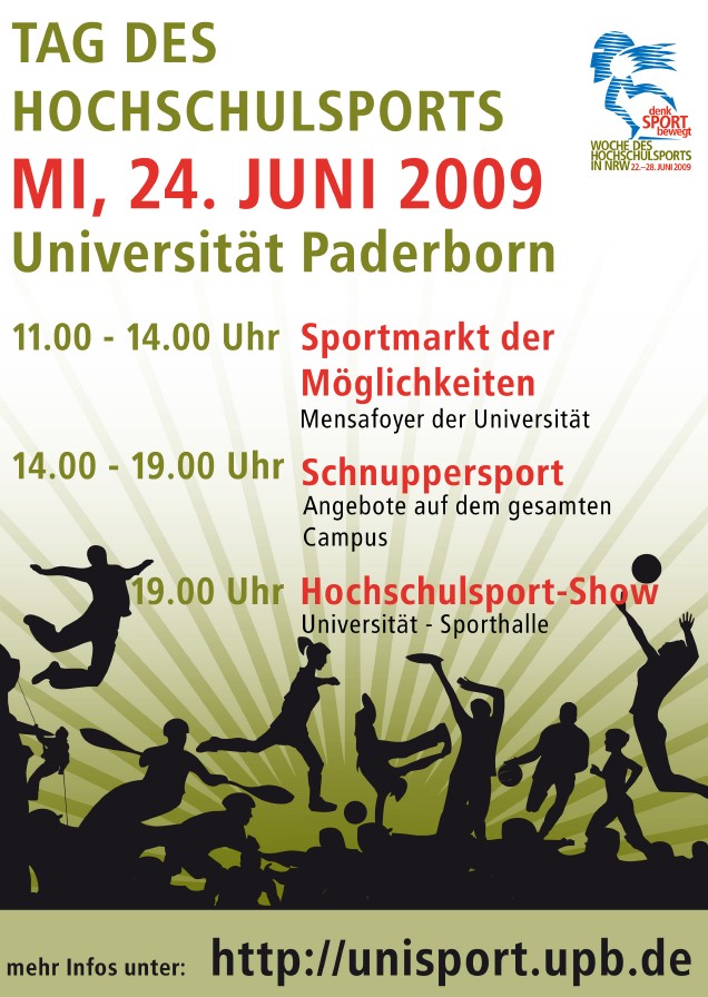 Der Hochschulsport der Universität Paderborn richtet im Rahmen der „Woche des Hochschulsports in NRW“ am Mittwoch, 24. Juni, einen „Tag des Hochschulsports“ aus. Studierende und Mitarbeiter der Universität sowie alle weiteren Interessierten werden eingeladen, sich über das Kursangebot zu informieren sowie bekannte und unbekannte Sportarten auszuprobieren.