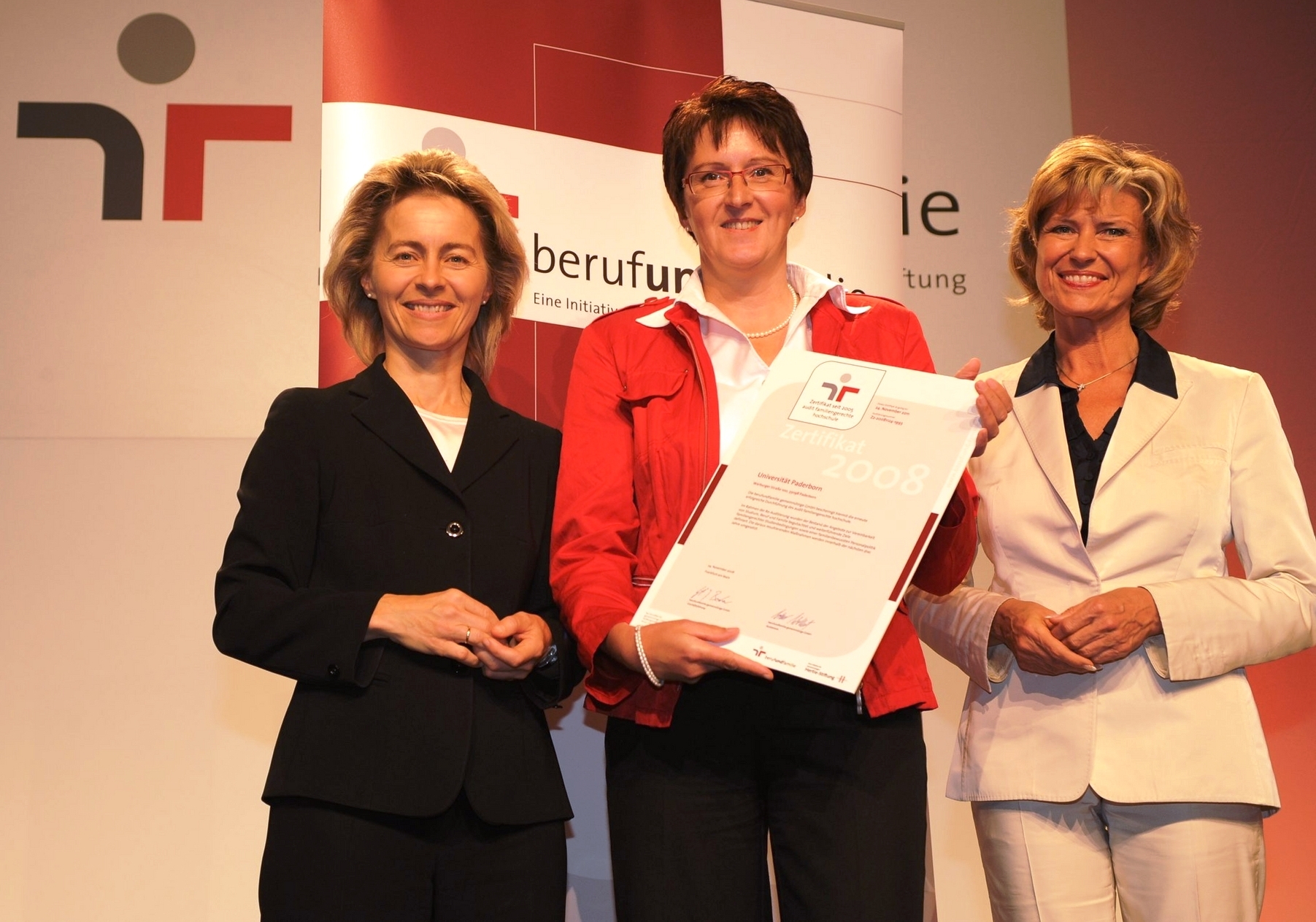 Am 17.6.2009 wurde der Universität Paderborn zum zweiten Mal das Zertifikat „audit familiengerechte hochschule der berufundfamilie gGmbH“ – einer Initiative der Gemeinnützigen Hertie-Stiftung – verliehen. Dr. Martina Gerdes-Kühn nahm stellvertretend für Kanzler Jürgen Plato die offizielle Urkunde von Bundesfamilienministerin Ursula von der Leyen entgegen. Die Ministerin hat gemeinsam mit Bundeswirtschaftsminister Karl-Theodor zu Guttenberg die Schirmherrschaft für das audit übernommen. Diese Auszeichnung dokumentiert die erfolgreiche Umsetzung der im Rahmen der ersten Auditierung geplanten Projekte und Maßnahmen zur Verbesserung der Vereinbarkeit von Studium, Beruf und Familie an der Universität Paderborn.