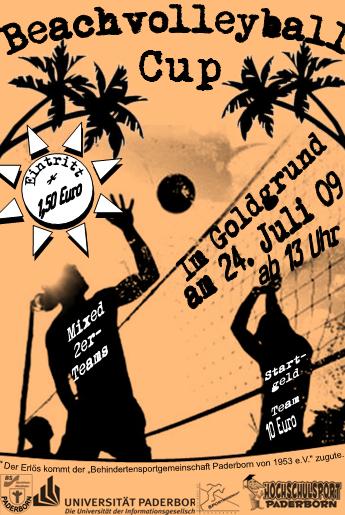 Paderborner Bachelorstudenten der Angewandten Sportwissenschaft veranstalten am 24. Juli ab 13 Uhr im Sport- und Bewegungszentrum Goldgrund einen Beachvolleyballcup. Der Beachvolleyballcup wird in 16 2er-Mixed-Teams ausgetragen und ist eine Charity-Aktion, deren Einnahmen dem Partnerverein " Behindertensportgemeinschaft Paderborn v. 1953 e.V." gespendet werden. Mitarbeiter der Universität, Studenten, Professoren und alle Paderborner sind herzlich eingeladen. Für das leibliche Wohl und Strandfeeling ist gesorgt.