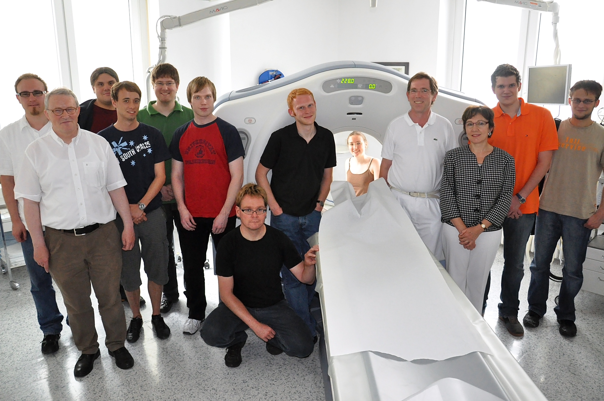 Dass Informatik und Medizin bestens zusammenpassen, zeigen sechs Masterarbeiten, elf Bachelorarbeiten und sieben Publikationen zum Thema „Medizinische Echtzeitgrafik“, die in der Fachgruppe „Computergrafik, Visualisierung und Bildverarbeitung“ am Institut für Informatik der Uni Paderborn in den letzten Jahren verfasst wurden. Bei einem Besuch des Paderborner St. Vincenz-Krankenhauses erläuterte Dr. med. Wolfgang Krings, Chefarzt der Radiologie-Abteilung, Informatikstudierenden die Funktionsweise eines modernen Computertomographie(CT)-Geräts. Mit diesem können eine Vielzahl von hochauflösenden digitalen Schichtaufnahmen des menschlichen Körpers gemacht werden. Die Schichtaufnahmen werden mit medizinischer Visualisierungssoftware zu einer dreidimensionalen Darstellung zusammengefügt.