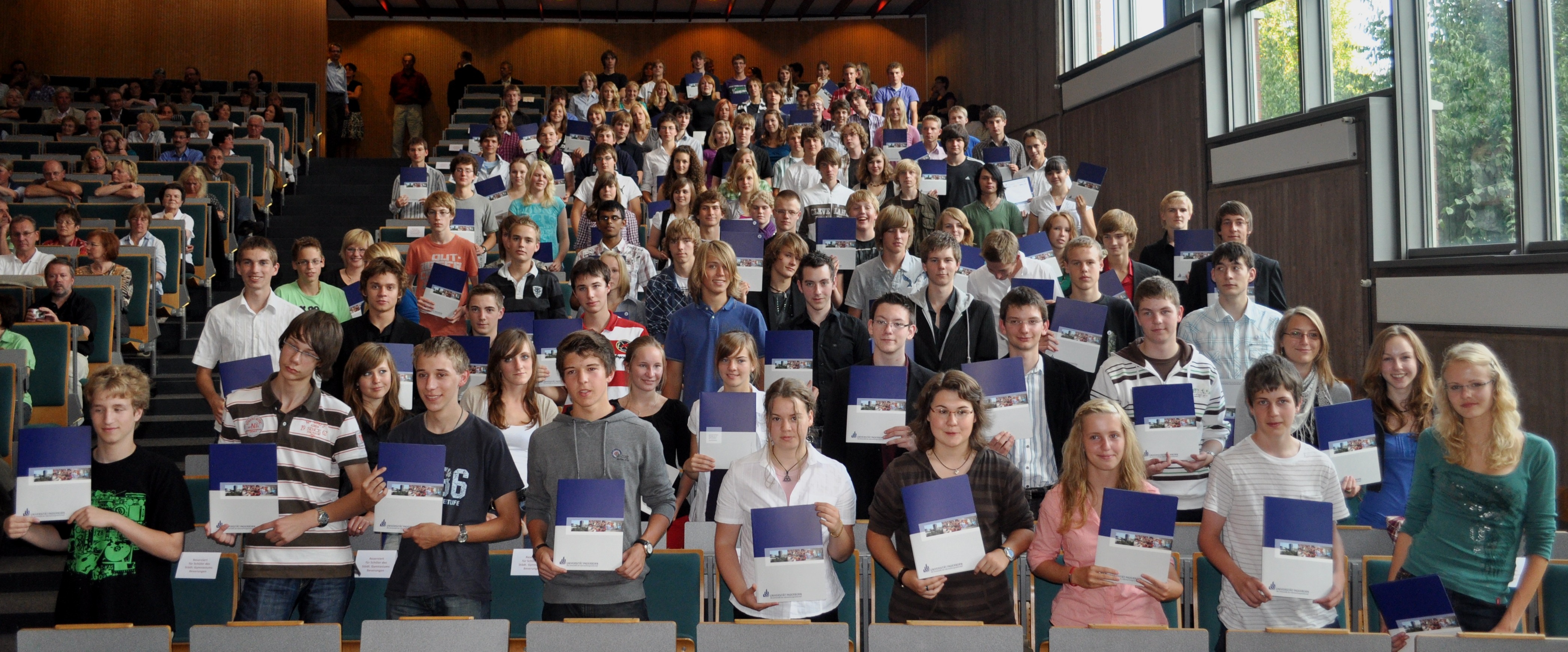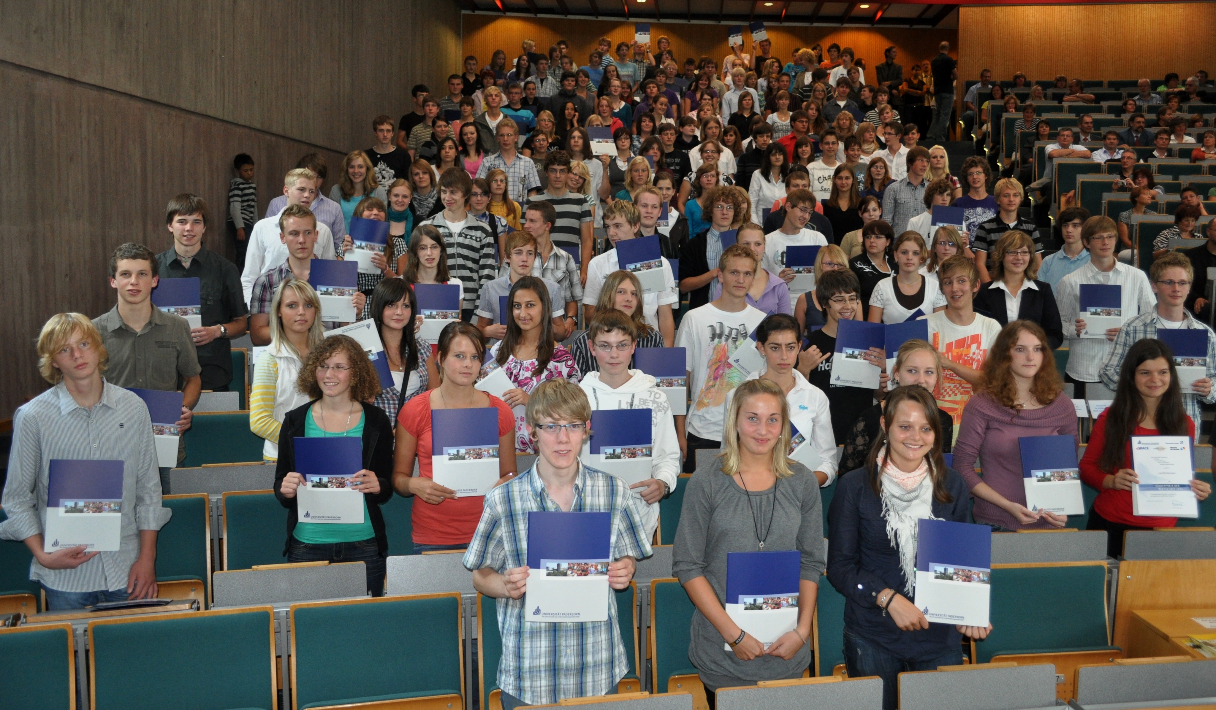 Die jeweils beste Schülerin und der beste Schüler aus den Klassen 9 und 10 aller Gesamtschulen und Gymnasien im Hochstift – fast 300 wurden nun im Audimax ausgezeichnet – konnten sich somit über ein Preisgeld von 75 Euro sowie eine Urkunde freuen. Selbst wenn Präsident Risch nur von einer „kleinen „Aufmerksamkeit für die bislang gezeigten Leistungen sprach“, sorgt der Förderpreis bei den Schülerinnen und Schülern doch für jede Menge Motivation. „Wir haben uns alle sehr über die Einladung gefreut und finden es schön, dass unsere bisherigen Leistungen beachtet werden. So möchten wir weiter machen“, sagte Julia Morscheck.