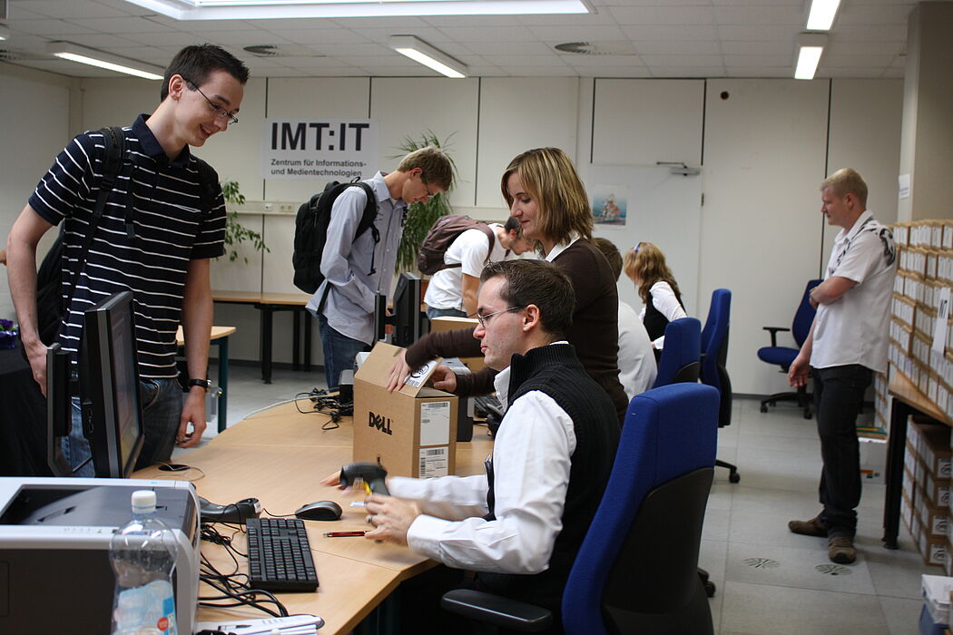 Die Mitarbeiterinnen und Mitarbeiter des Zentrums für Informations- und Medientechnologie (IMT) waren gespannt, welcher Andrang sie wohl erwarten würde: Am Montag, 21.09.2009, startete die Ausgabe der Netbooks an die neuen Erstsemester der Universität Paderborn. Dr. Gudrun Oevel, Leiterin des IMT, und ihre Mitarbeiter hatten alles bis ins Detail organisiert: Genug Raum war für die Menschenschlange abgesteckt, Markierungen verrieten die verbleibende Wartezeit, Hausmeister standen parat, um gegebenenfalls zu helfen.