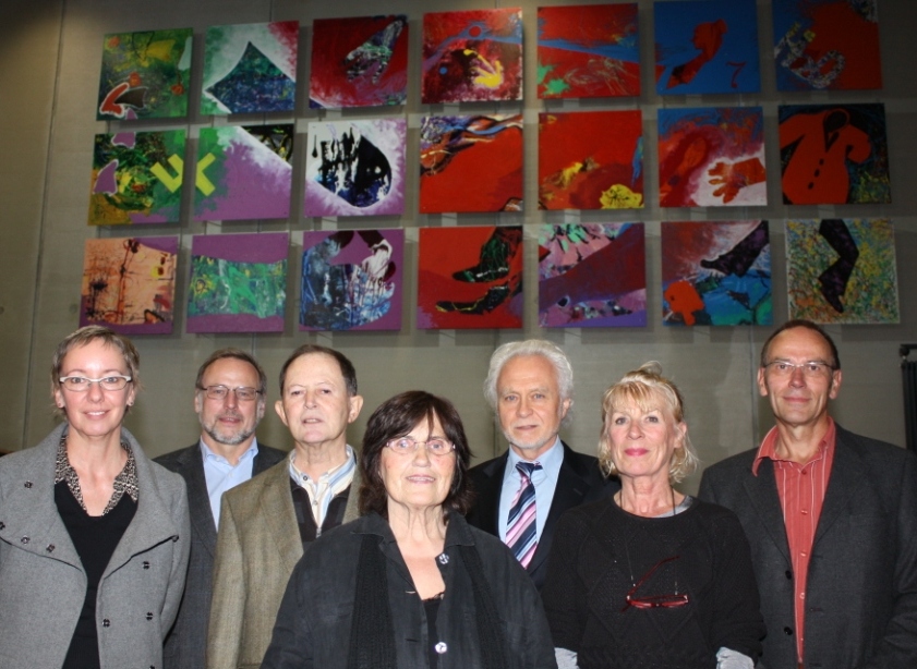 Prof. Keyenburg fand unter den Teilnehmern seines Seminars auch sieben Studierende bzw. Gasthörer, die sich für die Gestaltung der von der Firma Thyssen-Krupp gesponserten Edelstahlplatten begeistern konnten. Matthias Drechsler, Agathe Gausmann, Elisabeth Jux-Hiltrop, Kathrin Lillge, Christiane Schildhorn, Ulla Timmermann und Ruth Türnich bekamen die Gelegenheit, experimentell die viskos-flüssigen Eigenschaften der hochwertigen Industrielacke auf ihre ästhetischen Möglichkeiten hin zu testen. Unter dem lenkenden Einfluss von Professor Keyenburg fügten sich die individuell bemalten Tafeln schließlich zu einem in sich geschlossenen Gesamtwerk zusammen.