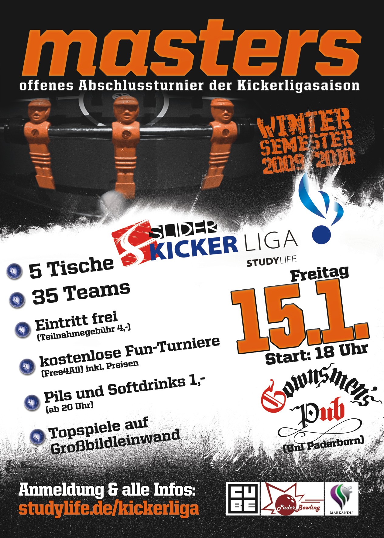 Doch um die Saison angemessen ausklingen zu lassen, findet losgelöst vom Ligabetrieb das große Abschlussturnier, das Masters, am Freitag, 17.01.2010, um 18 Uhr im Gownsmen`s Pub der Universität Paderborn statt. Nicht nur Zeit und Wochentag sind neu – erstmalig stehen bei dem Turnier Hohlstangenkickern zur Verfügung. Als weitere Highlights werden kostenlose Fun-Turniere für alle sowie ab 20 Uhr (für Teilnehmer den ganzen Abend) Softdrinks und Bier für 1 Euro angeboten.