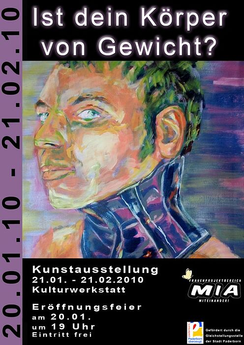 Organisiert vom Frauenprojektbereich Mia der Universität und der Gleichstellungsstelle der Stadt Paderborn, zeigt die Ausstellung die unterschiedlichen Interpretationen von Körper und Geschlecht. Die Diskussion um eine konstruierte Geschlechtlichkeit und die Frage nach dem biologischen und sozialen Geschlecht ist nach wie vor im gesellschaftlichen Leben, zum Beispiel in der Universität und im Beruf von Interesse. Im Rahmen der Ausstellungseröffnung am 20. Januar werden Ideen und Assoziationen in Form von Musik, Literatur und Tanz vorgestellt. Die Kunstwerke und Fotographien sind einen Monat lang bis zum 21. Februar im Ausstellungsflur der Kulturwerkstatt zu sehen.