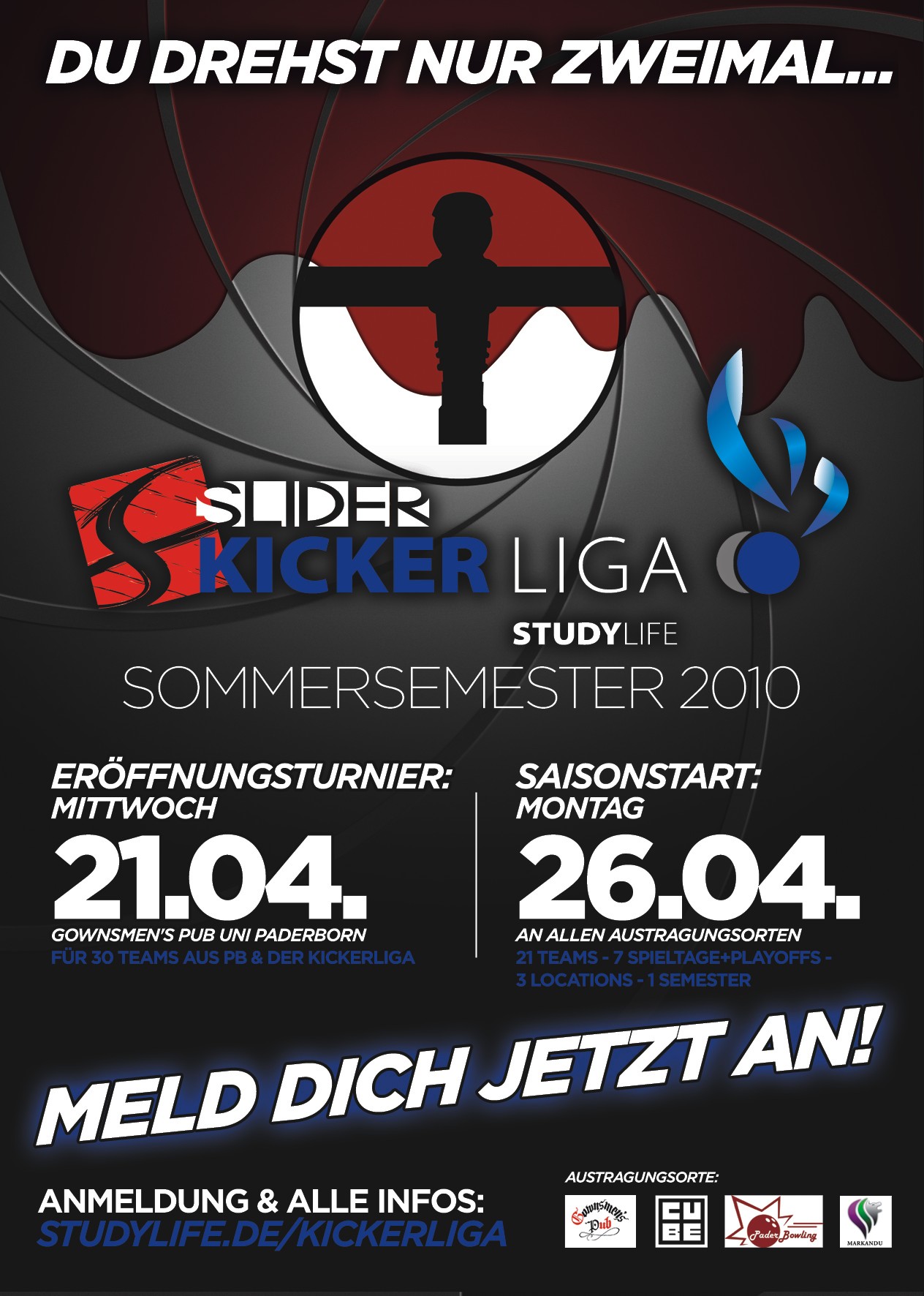 Am Mittwoch, den 21.4., fällt der Startschuss zur mittlerweile 6. Saison des beliebten Freizeitevents an der Universität Paderborn. Im Gownsmen`s Pub haben 30 Teams ab 19 Uhr die Chance, ihr Können am Kickertisch unter Beweis zu stellen und in sportlich-gemütlicher Atmosphäre um die begehrten Preise örtlicher Sponsoren und Förderer zu wetteifern. Also kommt vorbei und macht mit.