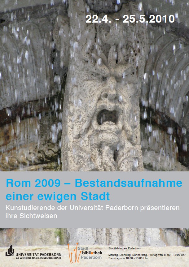 Die künstlerischen Ergebnisse einer Stadterkundung von Studierenden der Universität Paderborn in Rom sind vom 22.4.-25.5. in der Ausstellung „Roma 2009 – Bestandsaufnahme einer ewigen Stadt“ in der Stadtbibliothek zu sehen. Zur Eröffnung mit begleitender Performance am Mittwoch, 21. April, 18 Uhr, sind alle Kunstinteressierten recht herzlich eingeladen.