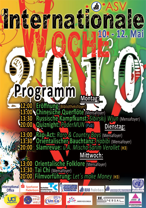 Es ist wieder soweit. Wir, die ASV (Ausländische Studierendenvertretung), möchten euch auch in diesem Jahr zur Internationalen Woche 2010, einem großen kulturellen Event an der Universität Paderborn, einladen. Vom 10. bis 12. Mai habt ihr die Möglichkeit, die verschiedensten Kulturen eurer Kommilitonen näher kennen zu lernen. Neben einer Vielzahl von Ständen, unterstützt von verschiedenen Hochschulgruppen mit interkulturellem Hintergrund, haben wir ein buntes Programm für euch vorbereitet.