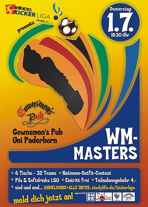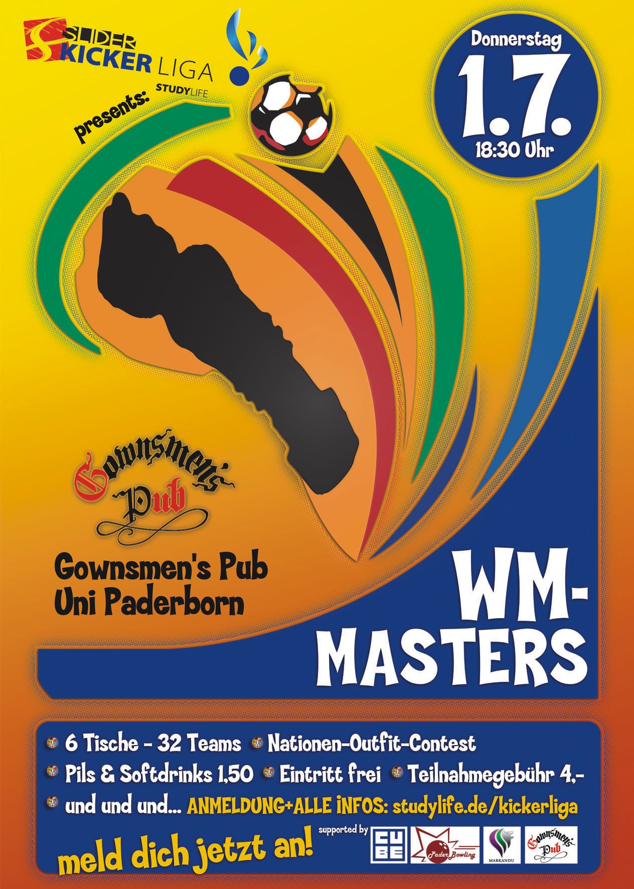 Ganz unter dem Motto der WM steht das Abschlussturnier der SLIDER KICKERLIGA, das große WM Masters. Erstmalig dürfen 32 Teams an diesem außerordentlichen Event teilnehmen, wenn am Donnerstag, 1. Juli, im Gownsmen`s Pub der Universität Paderborn um 18.30 Uhr der Startschuss fällt.