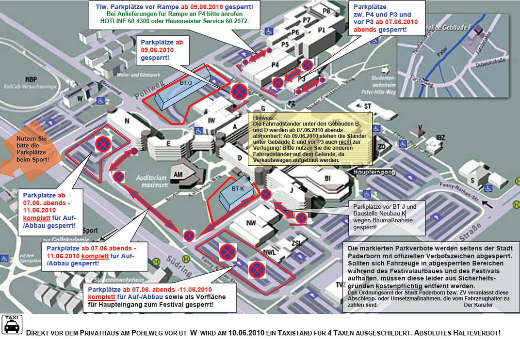 Dadurch ergeben sich Belastungen für den Lehr- und Arbeitsbetrieb. Dazu gehören eine gewisse Lärmbelästigung sowie aus Sicherheitsgründen und zum Schutz der Hochschulangehörigen eine Sperrung von Parkplätzen. Siehe hierzu Lageplan (PDF): „Parkplatzsperrungen ab 07.06.2010 AStA-Sommerfestival“.