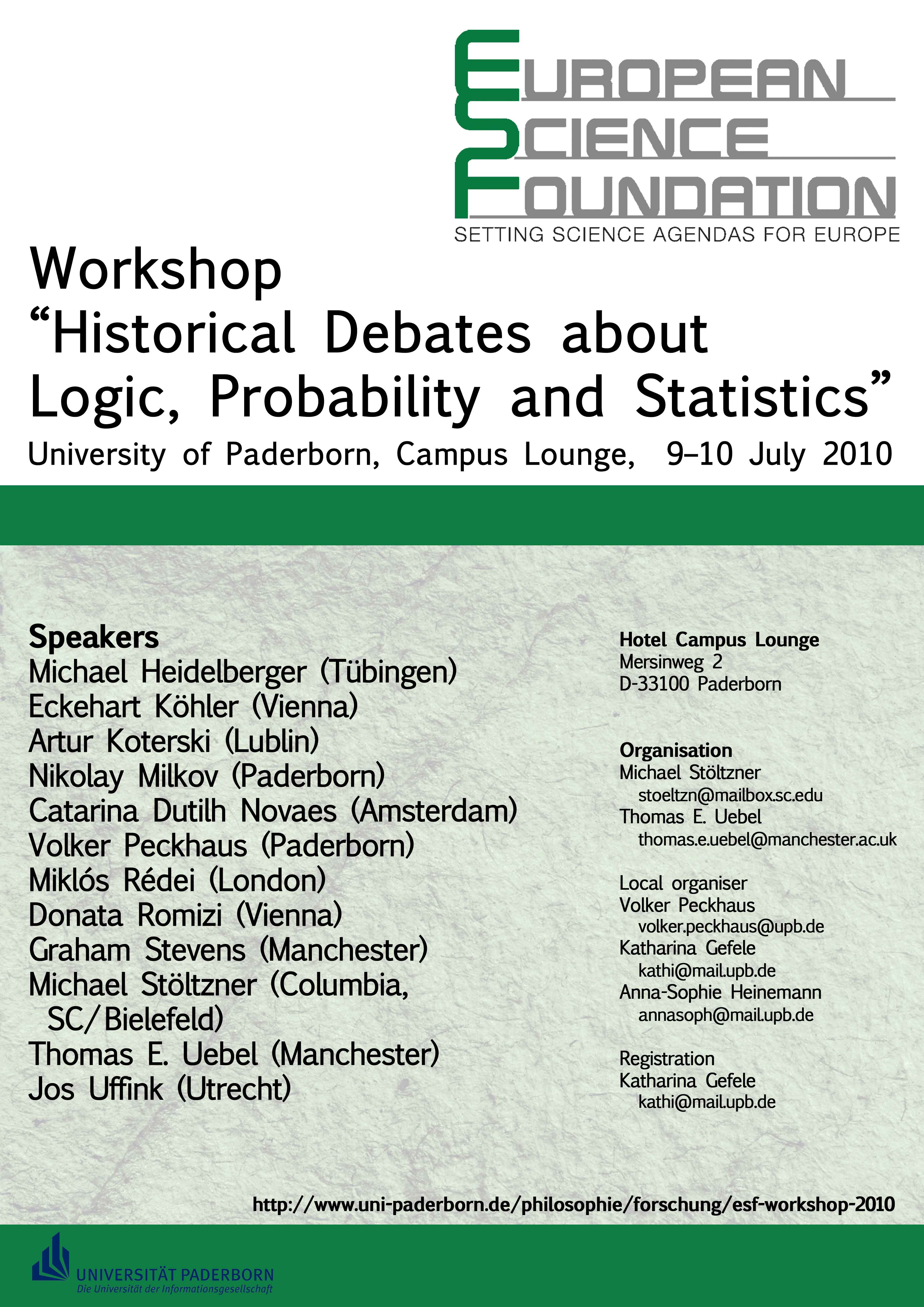 Vom 9. bis 10. Juli 2010 fand an der Universität Paderborn im Hotel Campus Lounge ein internationaler Workshop der European Science Foundation (ESF) zum Thema „Historical Debates about Logic, Probability and Statistics” statt. Finanziert aus dem 2008 gegründeten ESF-Programm “The Philosophy of Science in a European Perspective” (PSE) trafen sich Mitglieder der Forschungsgruppe “History of the Philosophy of Science”, um sich über ihre neuesten Ergebnisse auszutauschen.