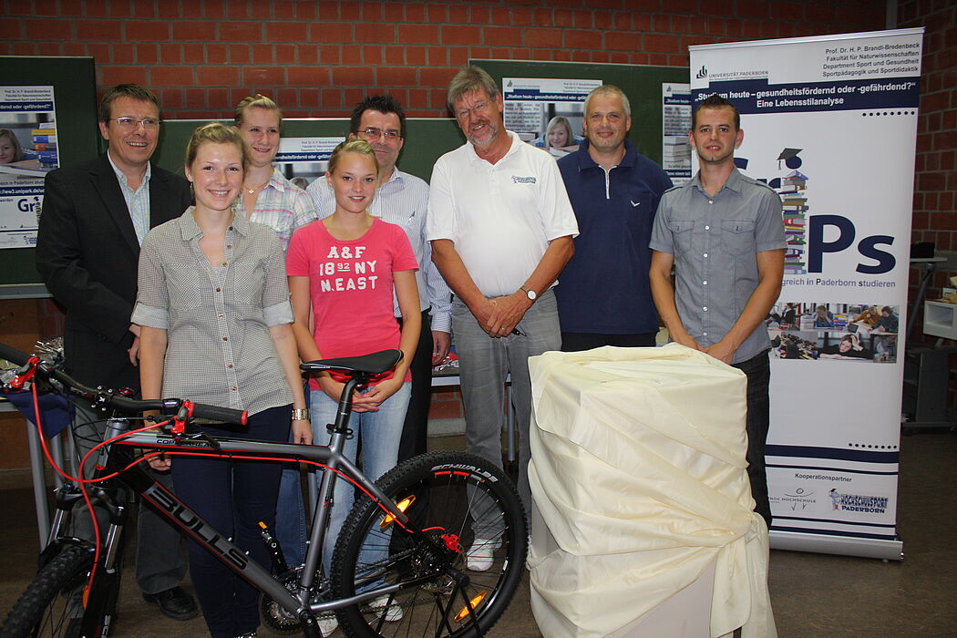 Foto (Frauke Döll): Die studentischen Preisträgerinnen mit dem Projektleiter Prof. Dr. Hans Peter Brandl-Bredenbeck und den Sponsoren (v. l.): Prof. Brandl-Bredenbeck, Amelie Grossek, Meike Frantz und Pia Görmann, Martin Hornberger vom SC Paderborn, Dieter Thiele vom Hochschulsport, Norbert Blome von der Techniker Krankenkasse und Markus Spenst von Zweirad-Schwede.