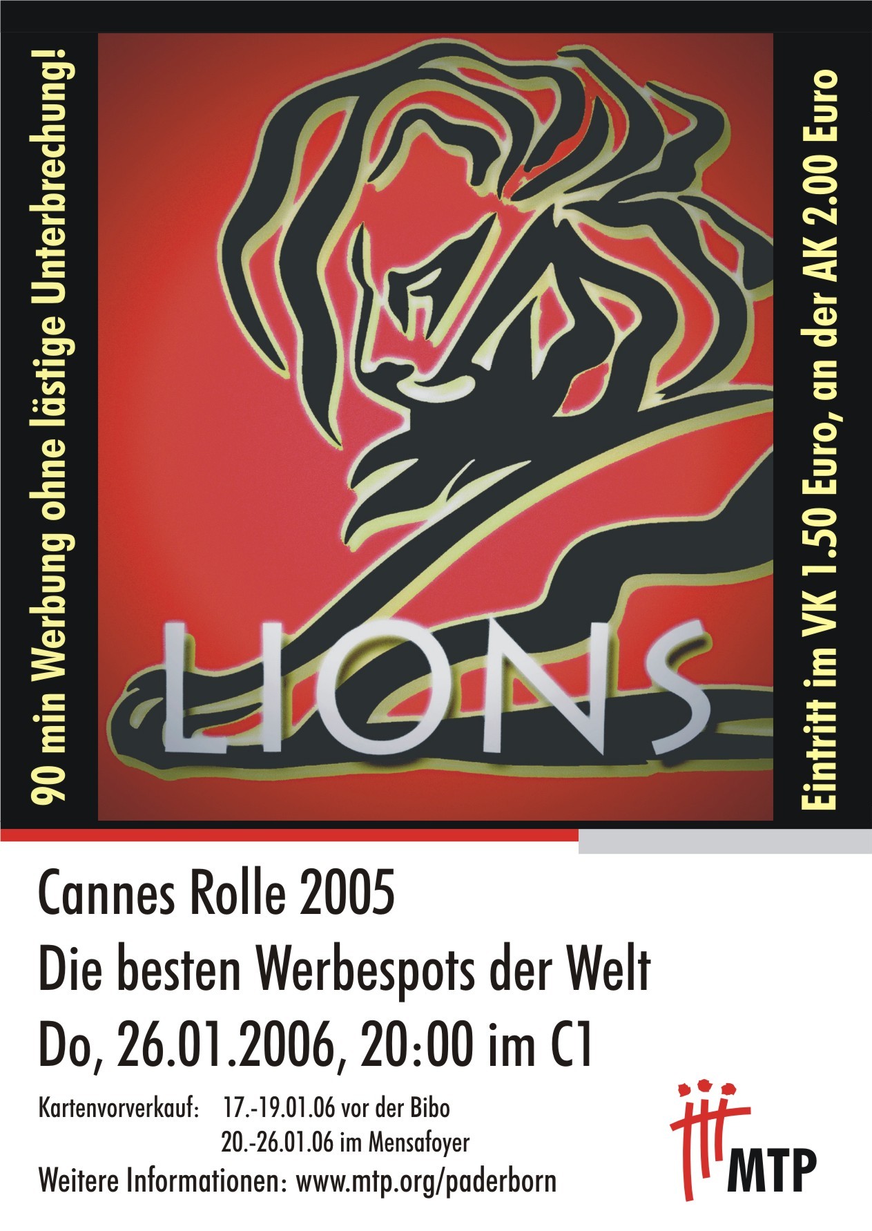 Am Donnerstag, 26.1.2006, 20.00 Uhr zeigt die studentische Vereinigung MTP (Marketing zwischen Theorie und Praxis e.V.) im Hörsaal C1 der Universität Paderborn die „besten Werbespots der Welt“.