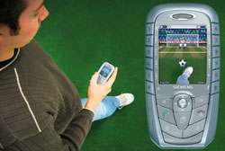 Mitmenschen die im WM-Jahr an der Bushaltestelle auf einem Bein stehen, mit dem anderen Schwung holen, dabei aufs Handy starren und anschließend in Torjubel ausbrechen, leiden entweder unter schwerem WM-Fieber oder sie nutzen die neueste AR-Anwendung von SBS auf ihrem Handy. Sie stammt aus dem C-LAB, der Innovationsschmiede von Siemens Business Services und der Universität Paderborn. Mit "Kick Real" trainieren Mobiltelefonierer das Elfmeterschießen mit körperlichem Einsatz. Virtuell sind bei diesem Spiel der Ball, Rasen und das Tor, geschossen wird mit dem eigenen Fuß. Auf den richten die Spieler die Kamera ihres Handys - und verbinden so das digitale Spielfeld mit der realen Umgebung. Man steht quasi mit einem Bein in der digitalen Welt. Das Spiel soll auch als Werbemittel im Rahmen der Fußball-WM 2006 genutzt werden - Gespräche mit Interessenten laufen bereits.